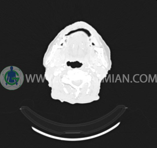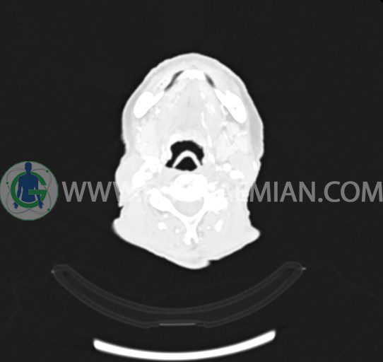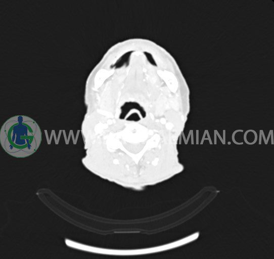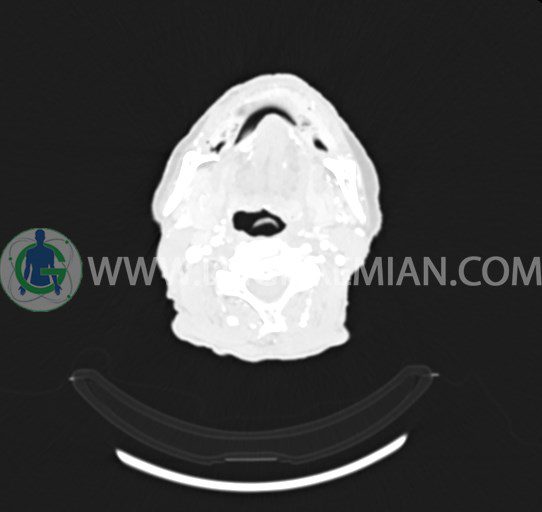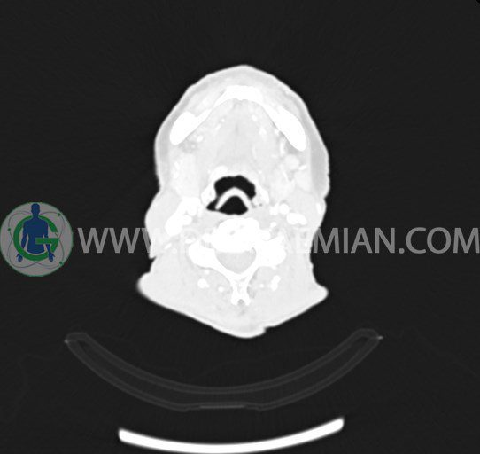 سی تی اسکن ستون فقرات یک روش تصویربرداری است که با استفاده از تشعشعات تصاویری با جزییات از ناحیه خالی گردن ایجاد میکند. در این کیس انفيلتراسيون تومورال صورت، نشانه های فیستول و لنف آدنوپاتی مشاهده می شود.