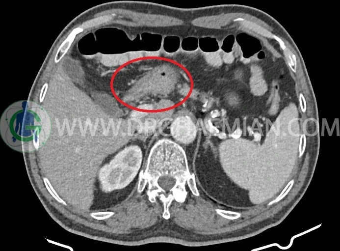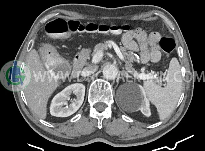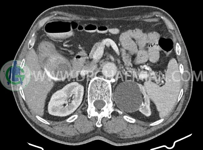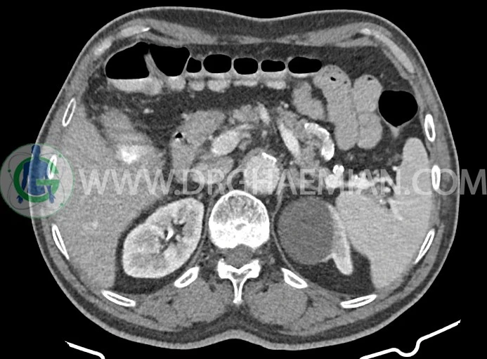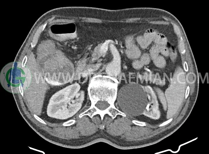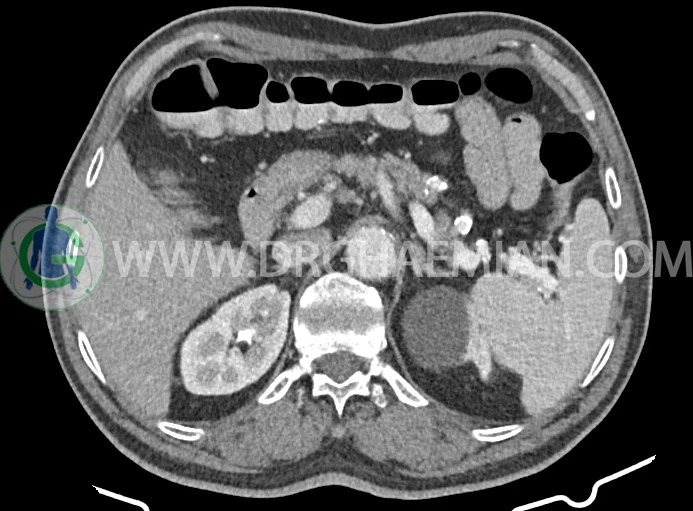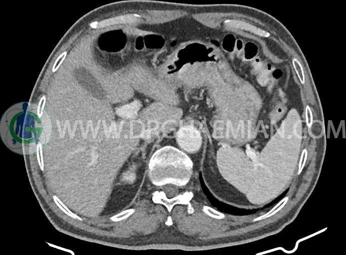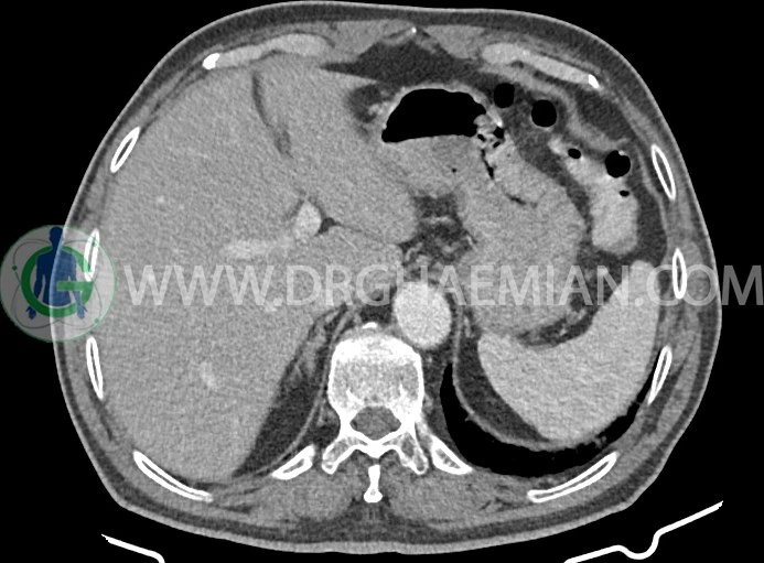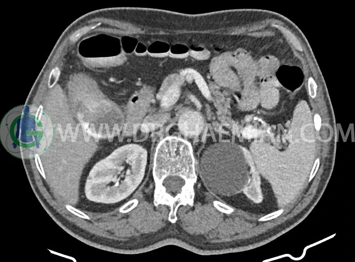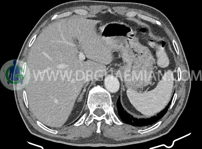 -افزايش ضخامت جداري احتمالاً انفيلتراسيون تومورال در کولون صعودي و خم کبدي به حداکثر ديامتر تقريبي 5cm ديده مي شود. Fat stranding و حداقل 8 لنفادنوپاتي رژيونال به حداکثر SAD=11m در اطراف اين ضايعه ديده مي شود. (T3, N2b)Stage: احتمالي توده
