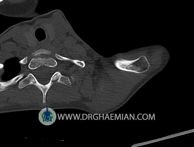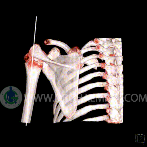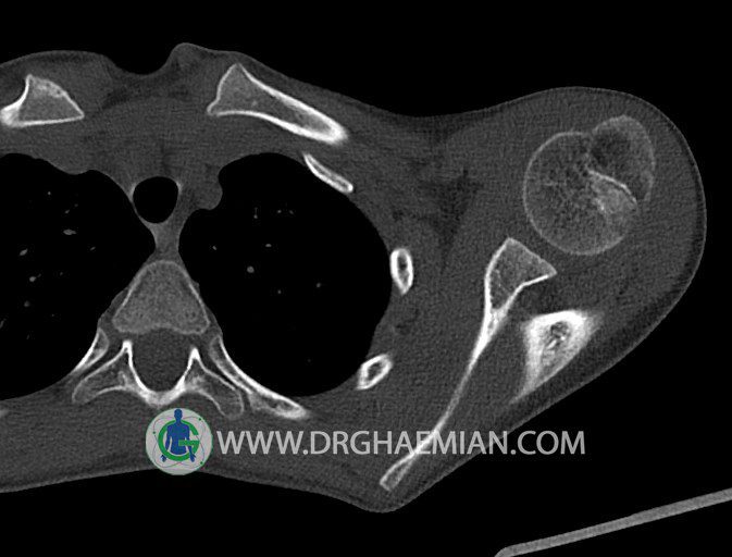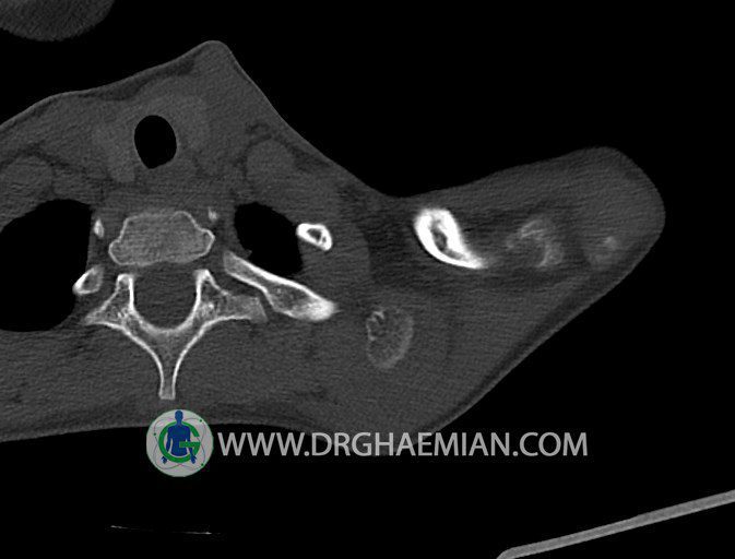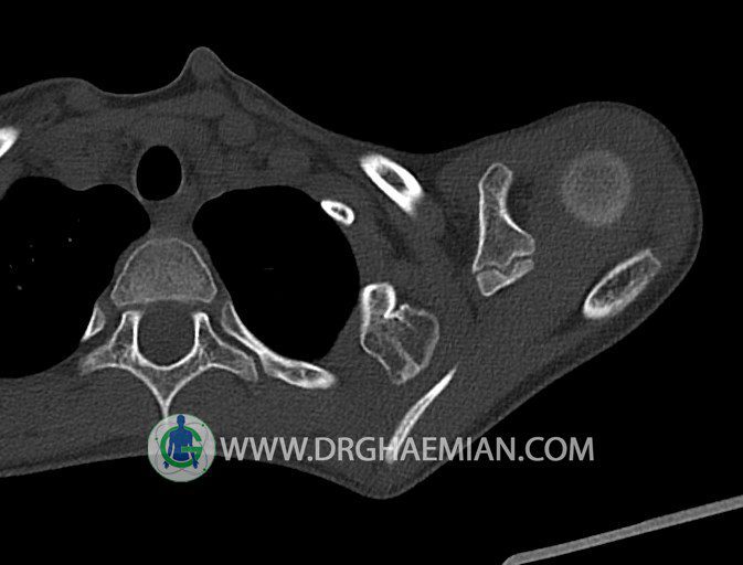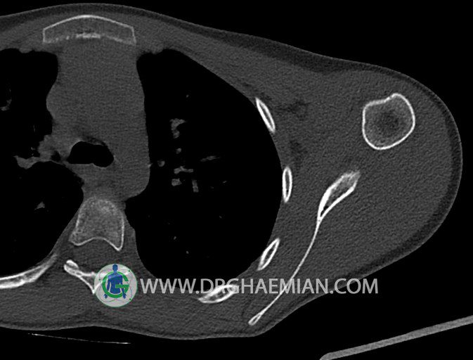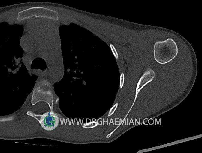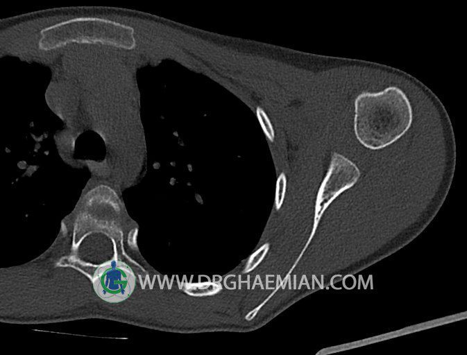 سی تی اسکن مفصل یک روش تصویربرداری است که با استفاده از تششعات ایکس تصاویری با جزییات از مفاصل بدن ایجاد میکند. در این کیس اگزوستوز کتف بیمار مشاهده می شود.