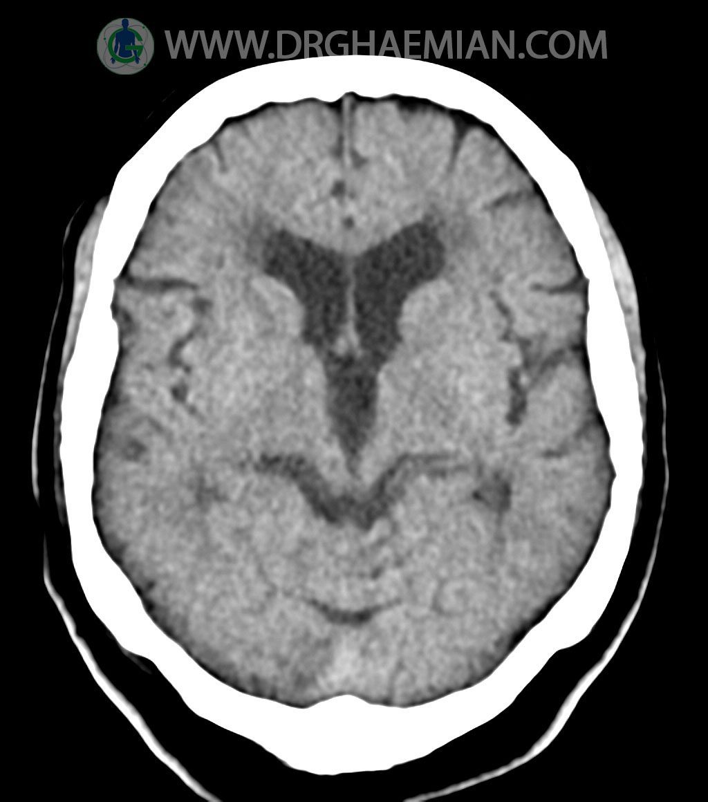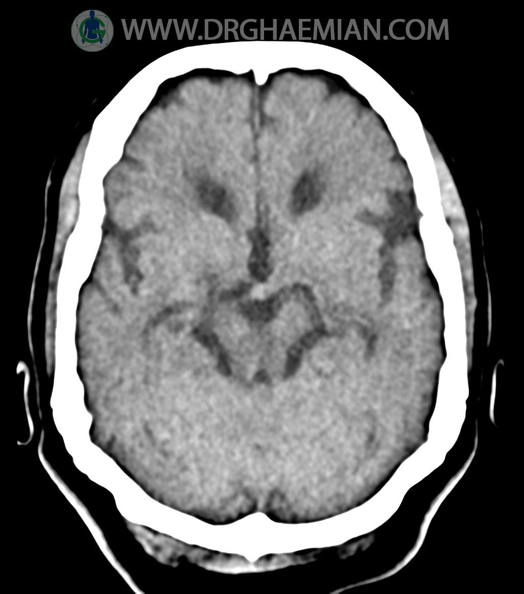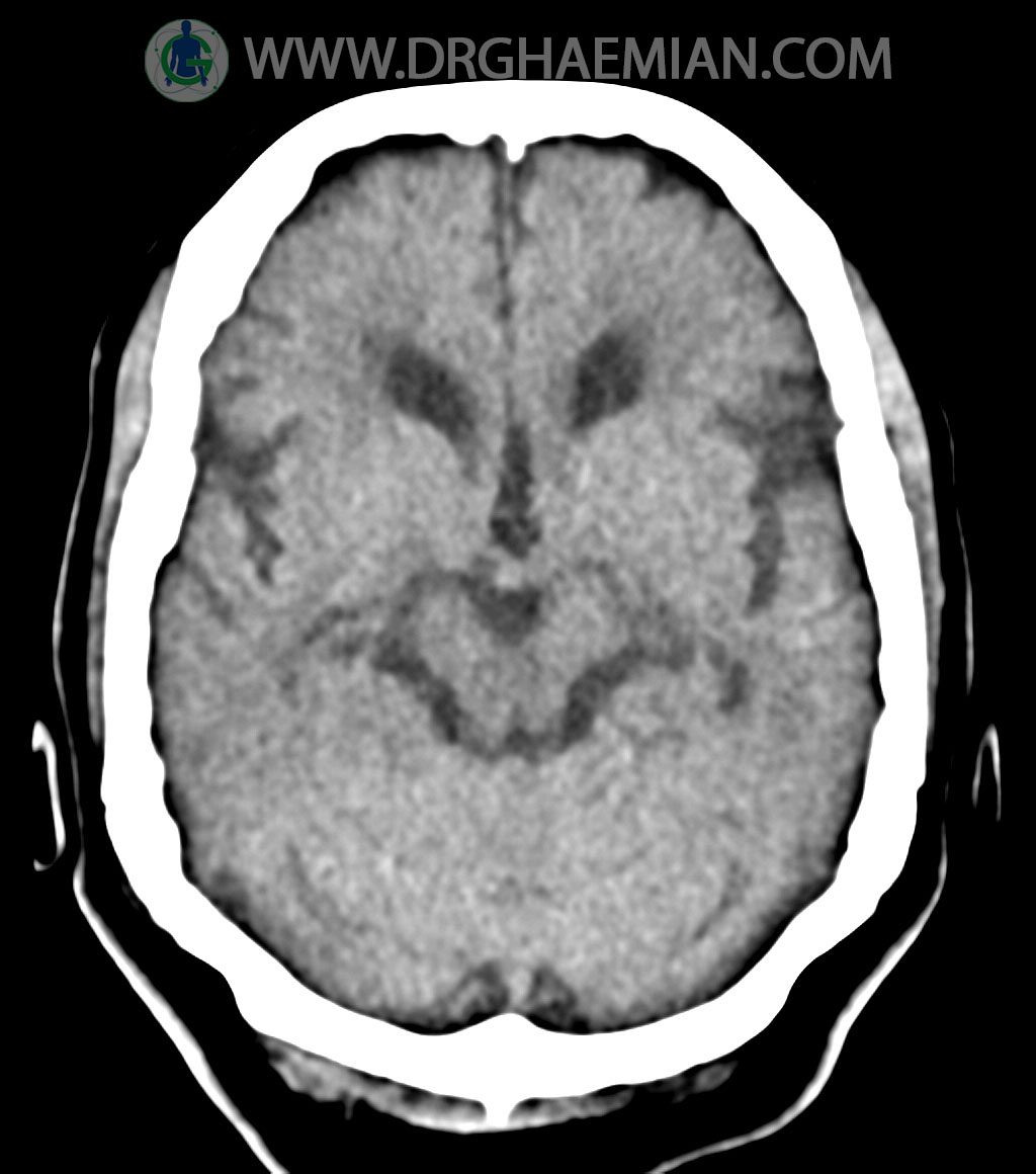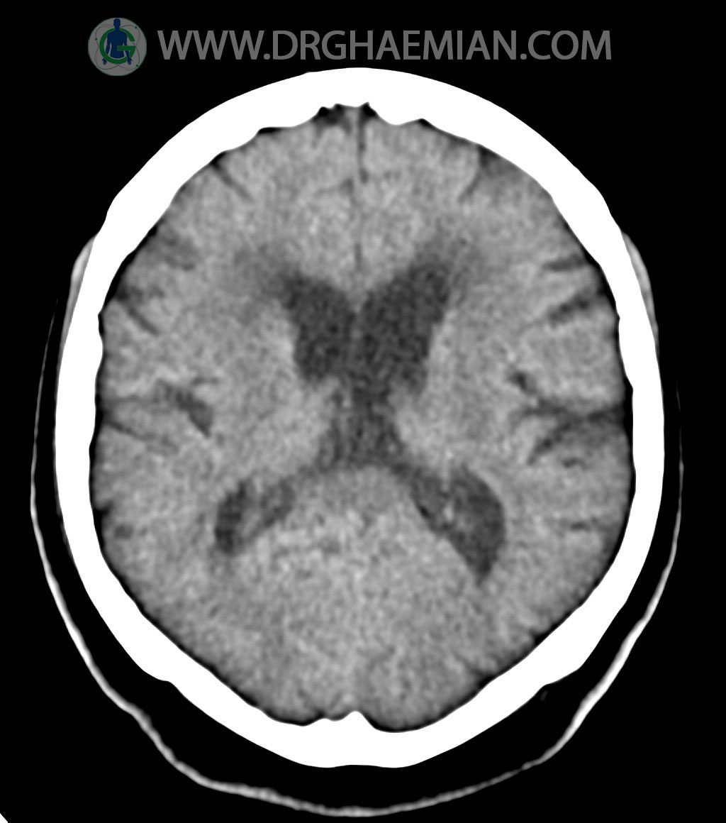 سی تی اسکن مغز با استفاده از اشعات ایکس تصاویری از سر که شامل جمجعه، مغز، حفره های چشمی و سینوس ها است ایجاد می کند. در این کیس ایسکمیک میکروواسکولار، سلای نسبتا خالی و سابقه ماستوئیدیت در سی تی اسکن بیمار مشاهده می شود.