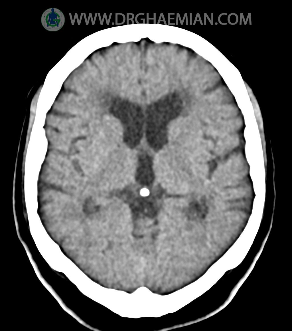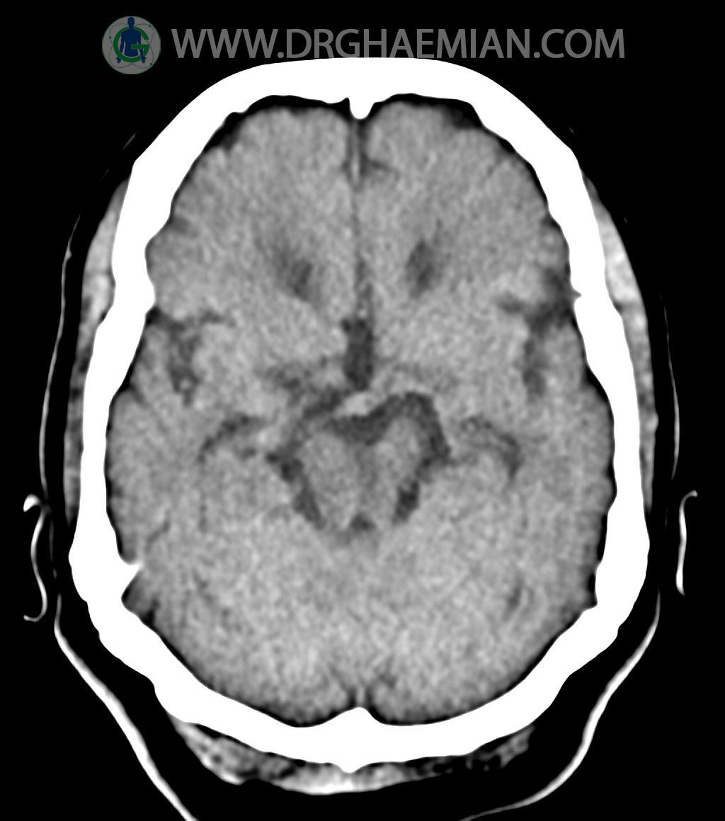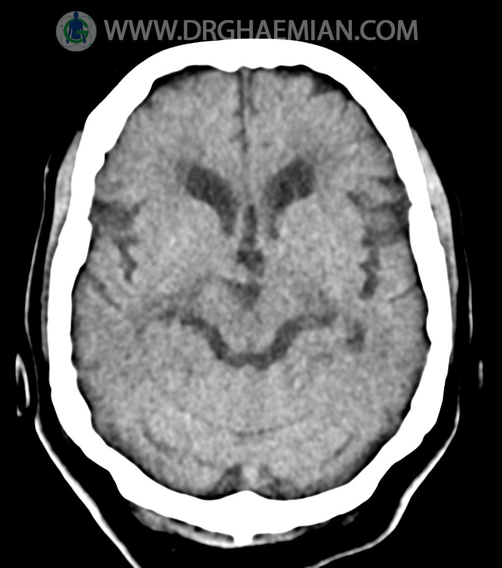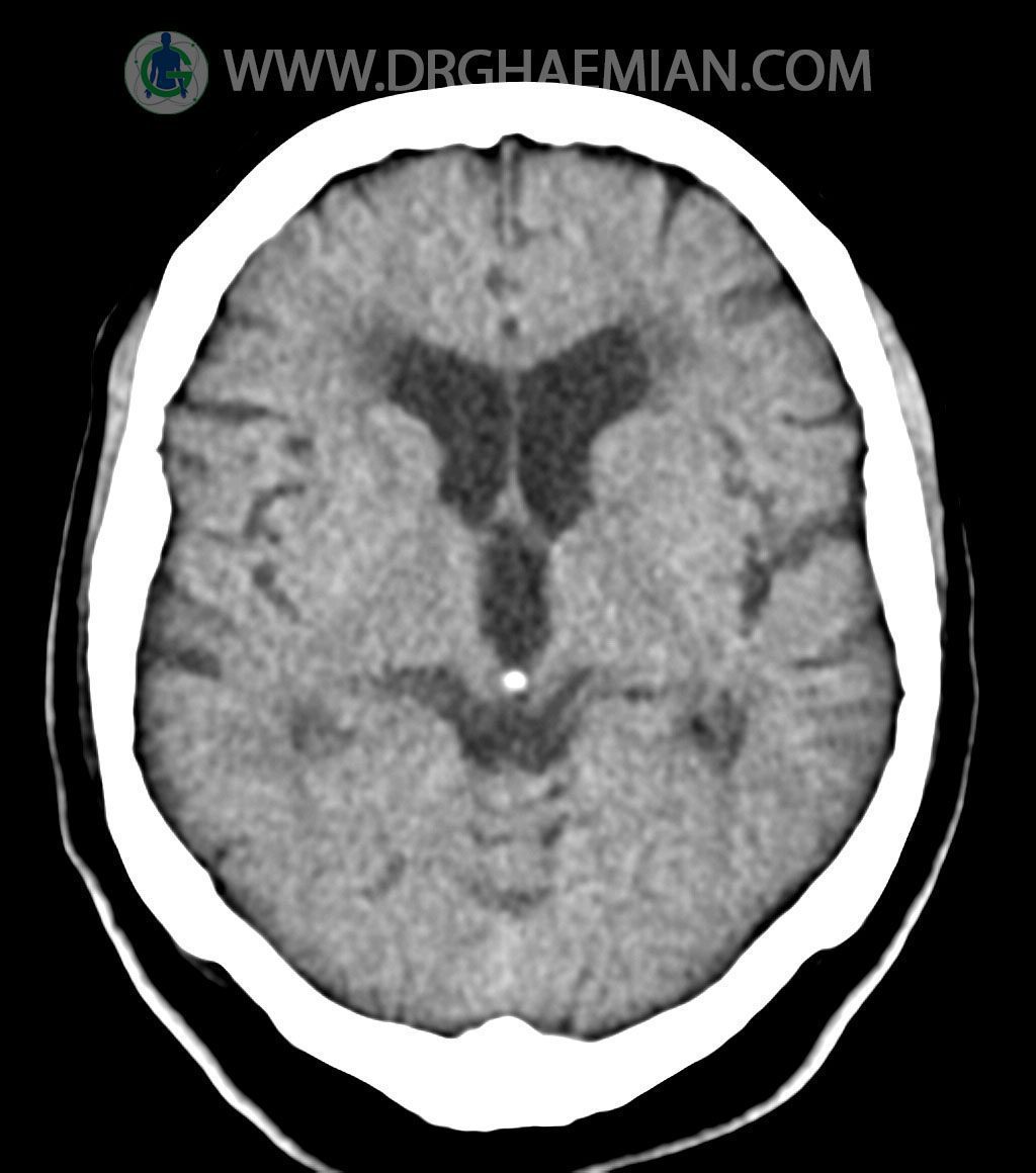سی تی اسکن مغز با استفاده از اشعات ایکس تصاویری از سر که شامل جمجعه، مغز، حفره های چشمی و سینوس ها است ایجاد می کند. در این کیس ایسکمیک میکروواسکولار، سلای نسبتا خالی و سابقه ماستوئیدیت در سی تی اسکن بیمار مشاهده می شود.