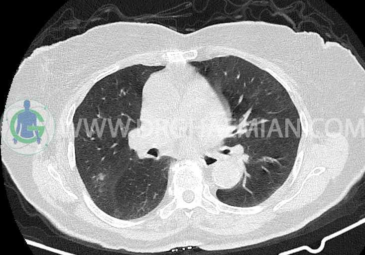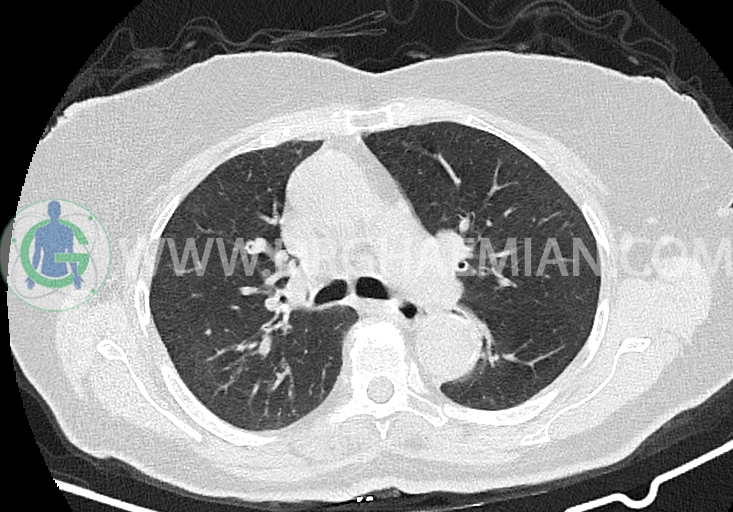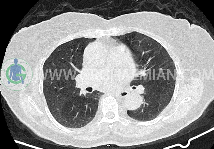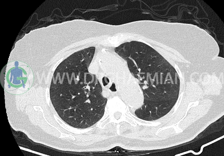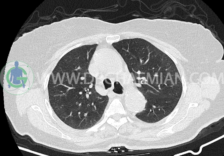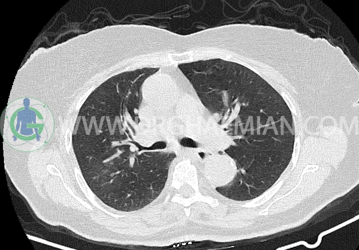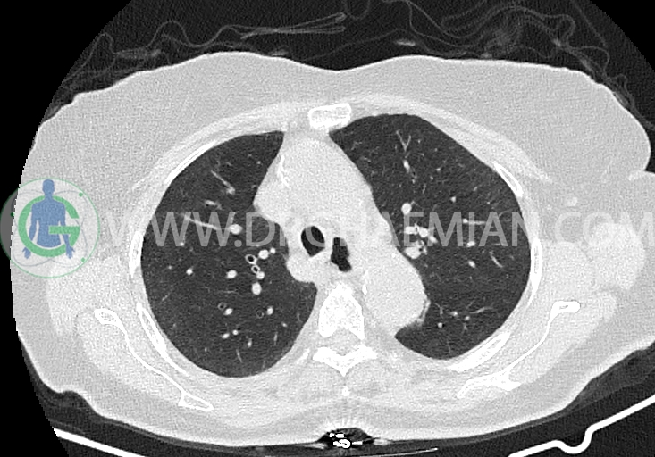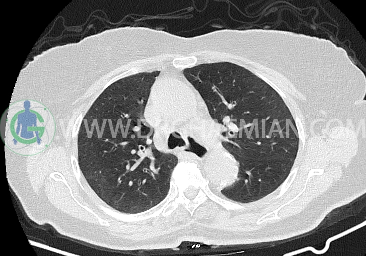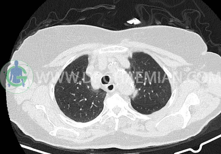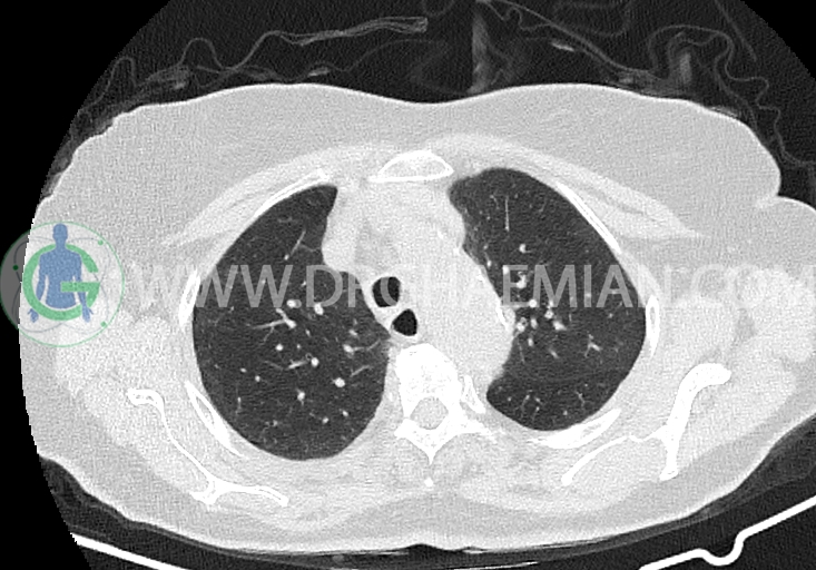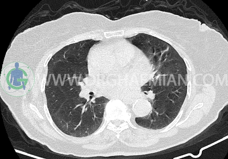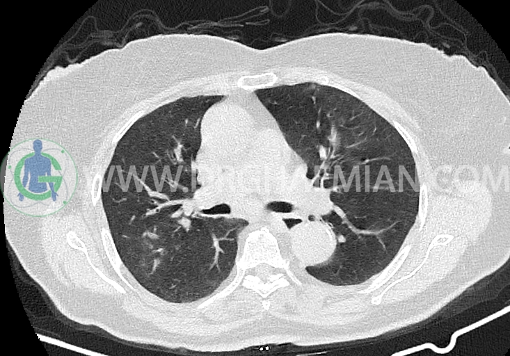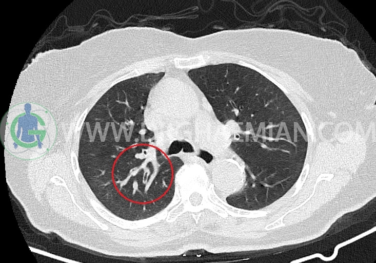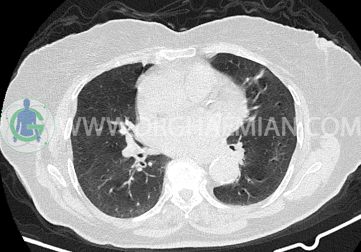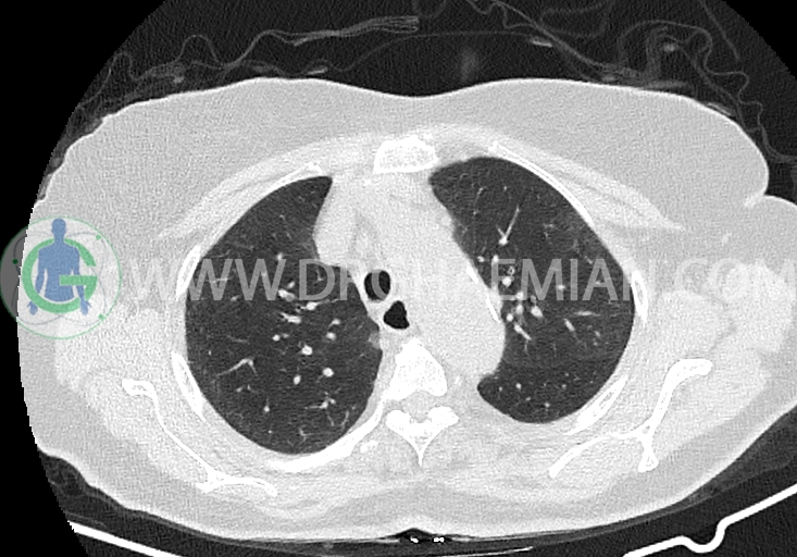 سی تی اسکن ریه با استفاده از اشعه ایکس تصاویر عرضی مقطعی از ریه و بالا تنه ایجاد می کند. در این کیس برونشيوليت، کانون های آتلکتازی، کلسیفیکاسیون دیواره آئورت، تغییرات DJD و نشانه های هیاتال فتق کشویی دیده می شود.