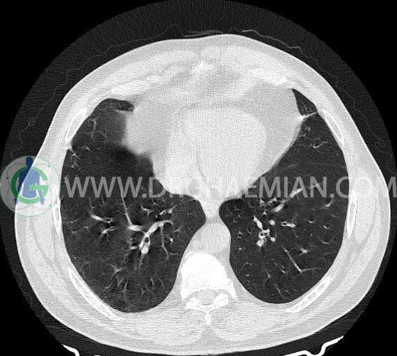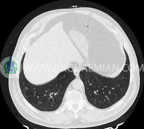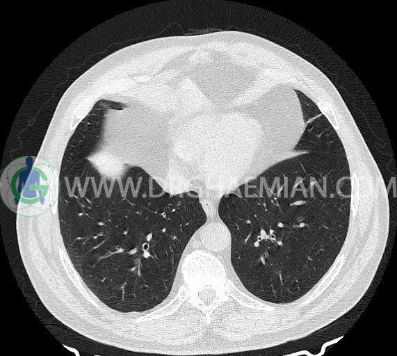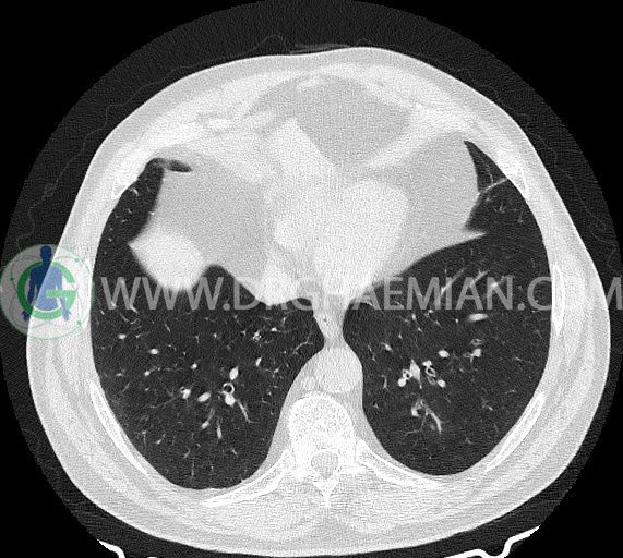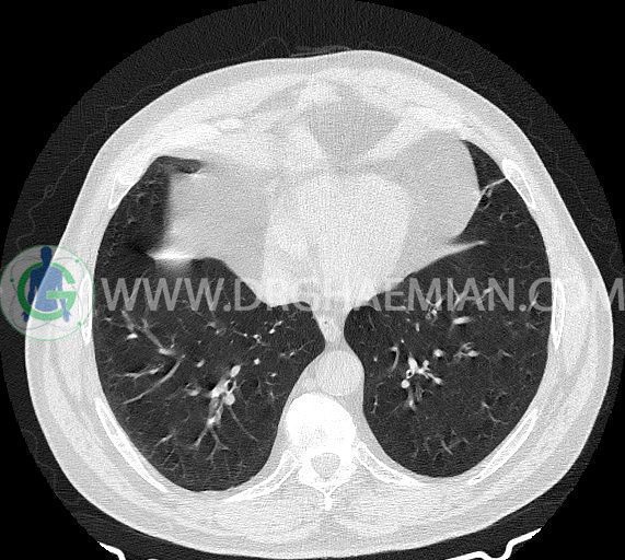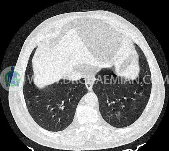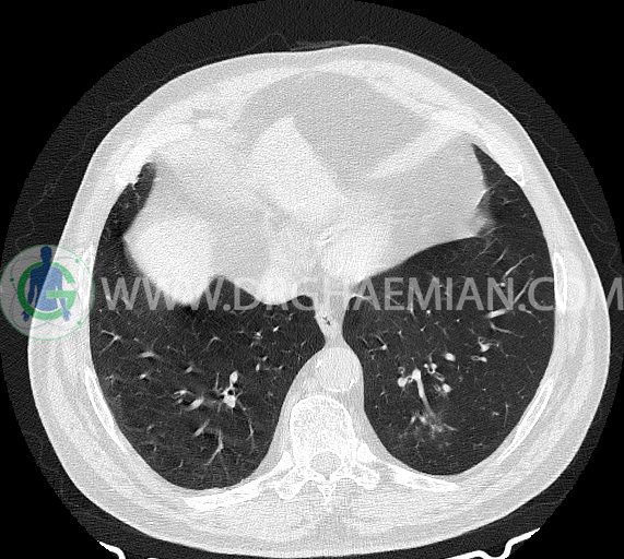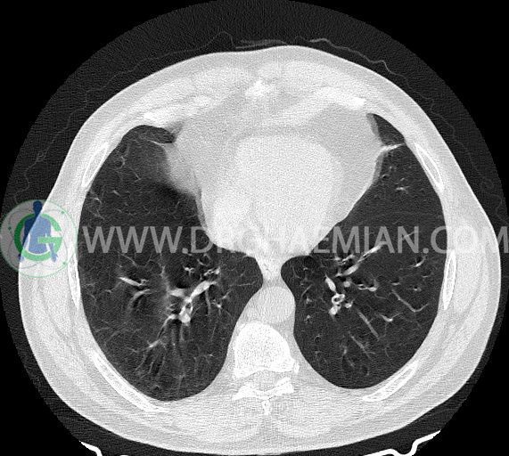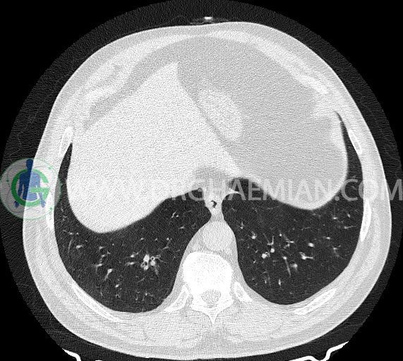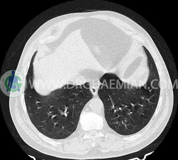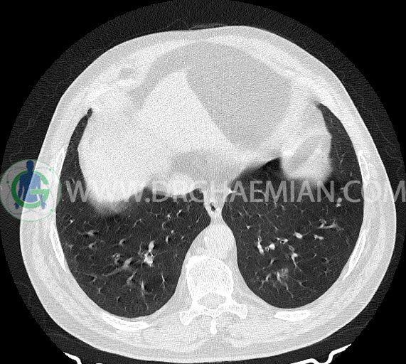 در HRCT از ریه ها (اسپیرال ، مولتی دیتکتور 16، مقاطع اگزیال با ضخامت 1mm بدون فاصله ) ، بدون کنتراست تزریقی :