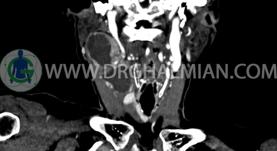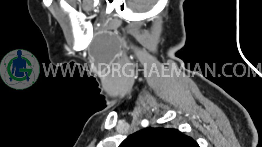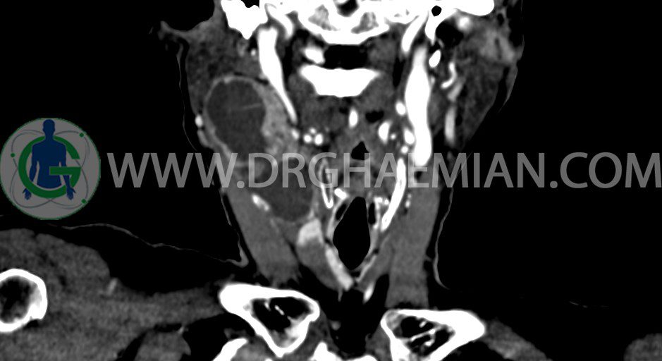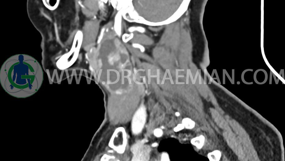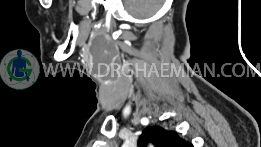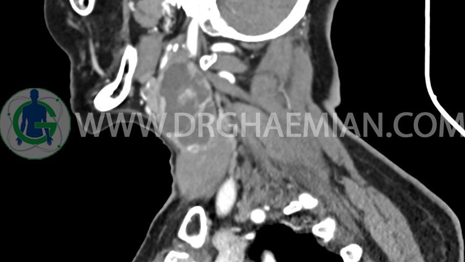 – توده ساليد – سيستيک به ابعاد mm 33 x 36 x 70 در مثل قدامي راست گردن، با enhancement قابل توجه