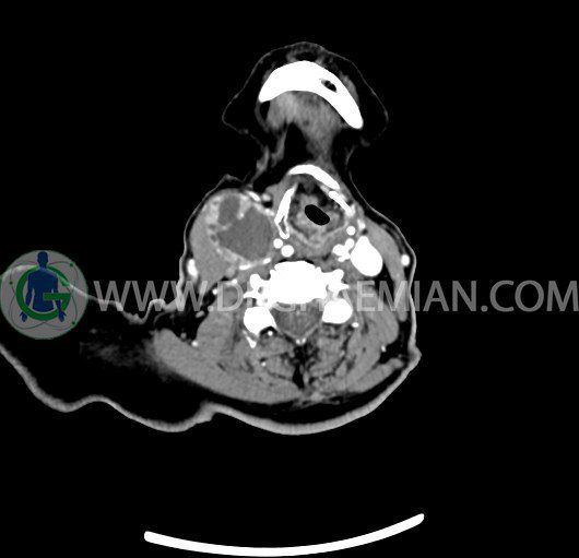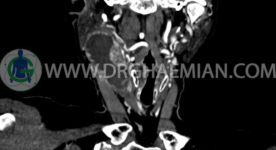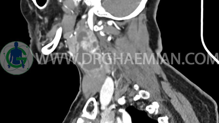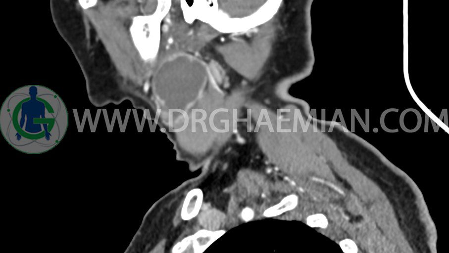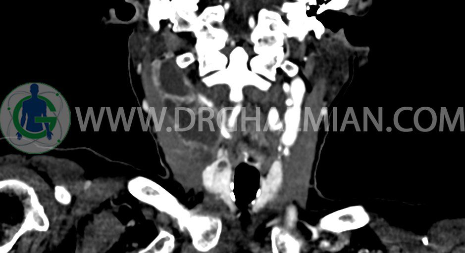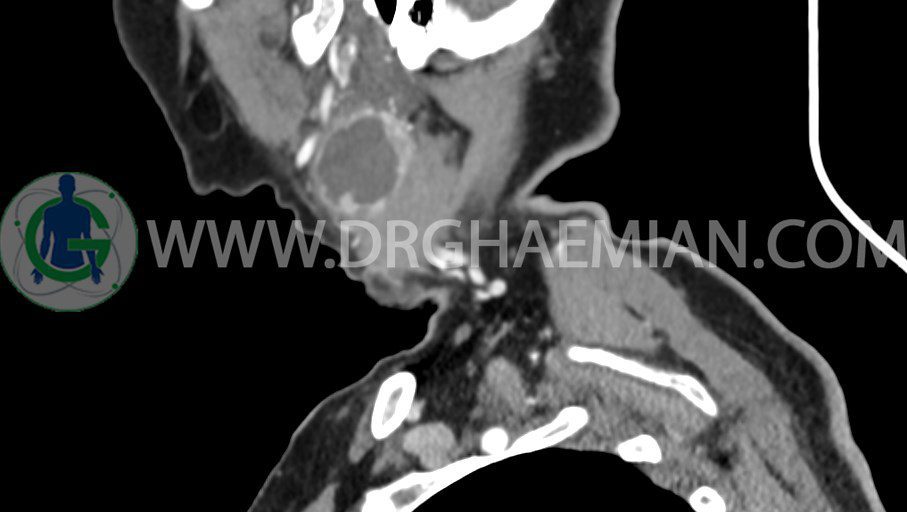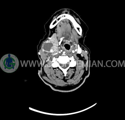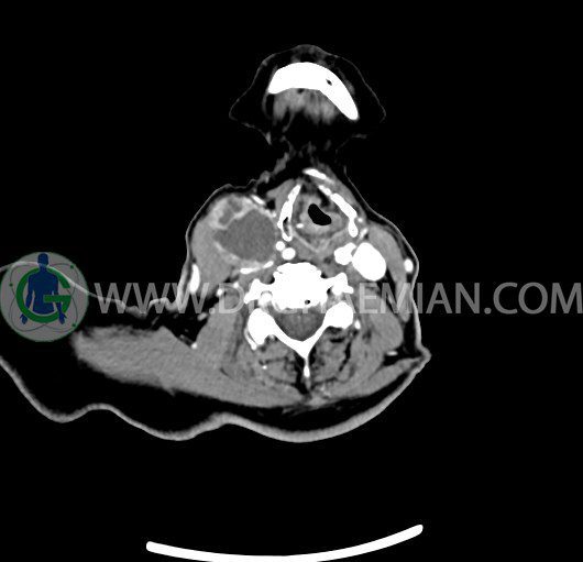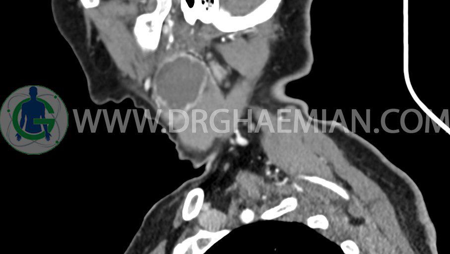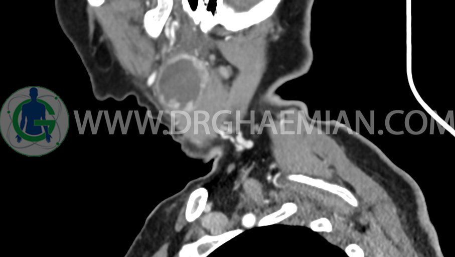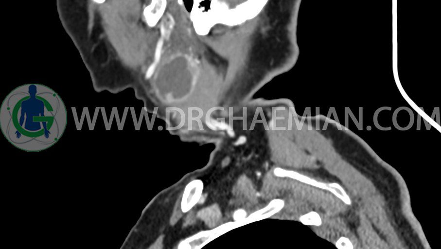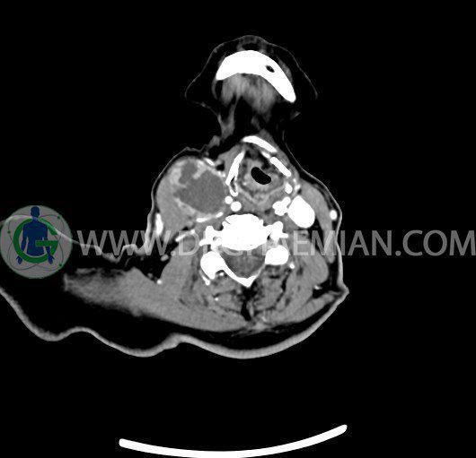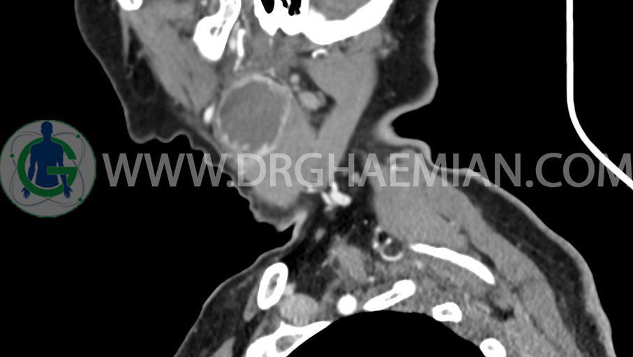 سی تی اسکن گردن یک روش تصویربرداری است که با استفاده از تشعشعات تصاویری با جزییات از ناحیه خالی گردن ایجاد میکند. در این کیس توده سیستیک گردن به ابعاد mm 33 x 36 x 70، لنفادنوپاتی نکروزه، نشانه های جراحی در طرف راست زبان و کاهش انحنای گردن به همراه اسکولیوزیس و تغییرات DJD در محره های C3/C4/C5/C6/C7 دیده می شود.