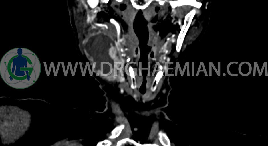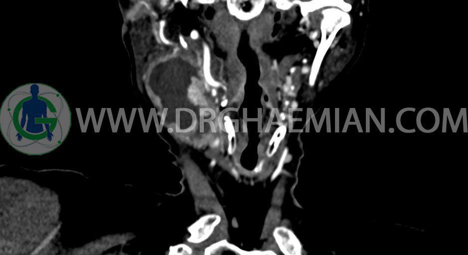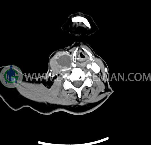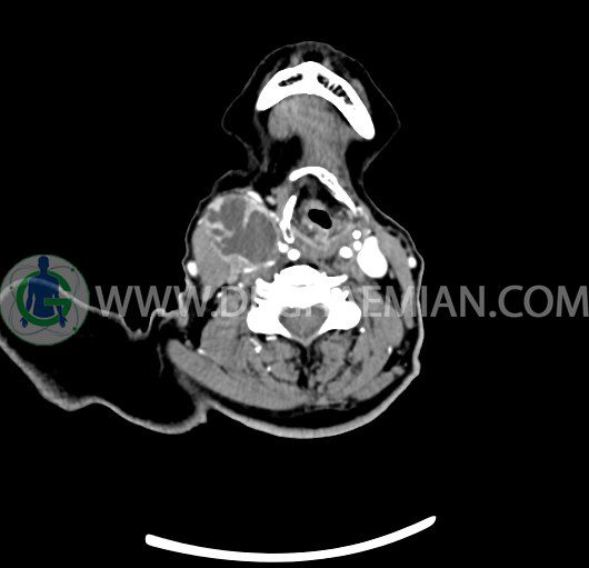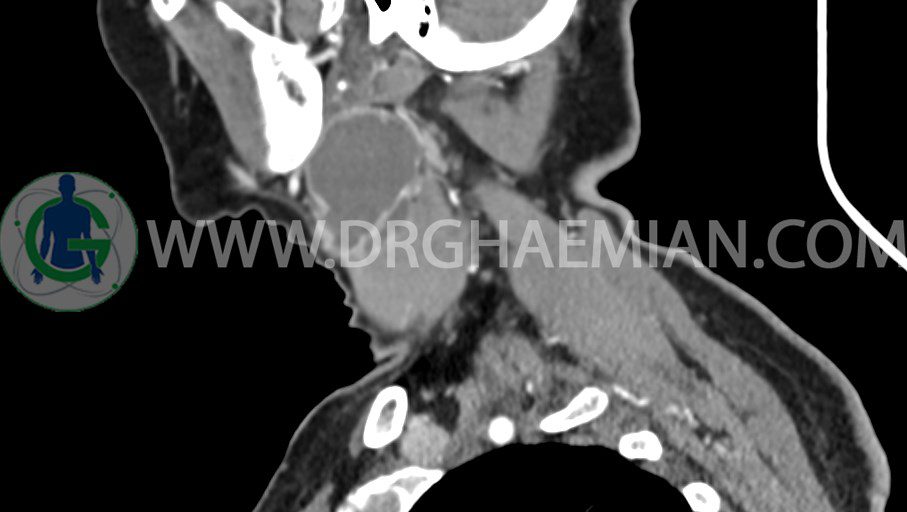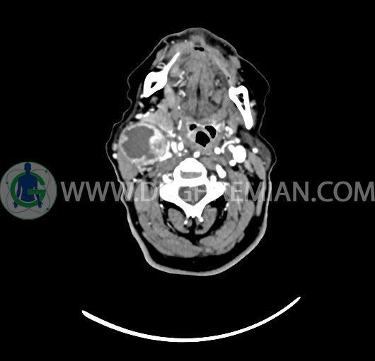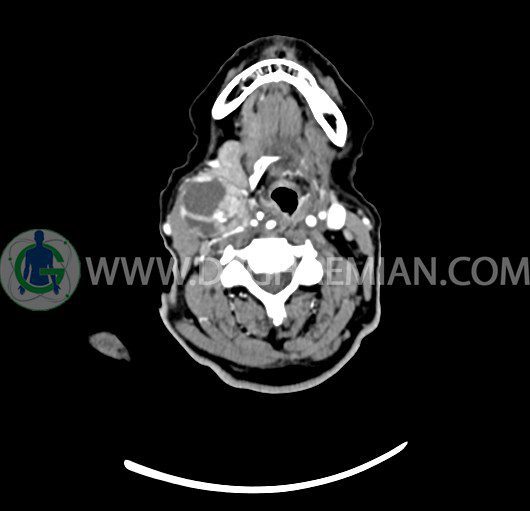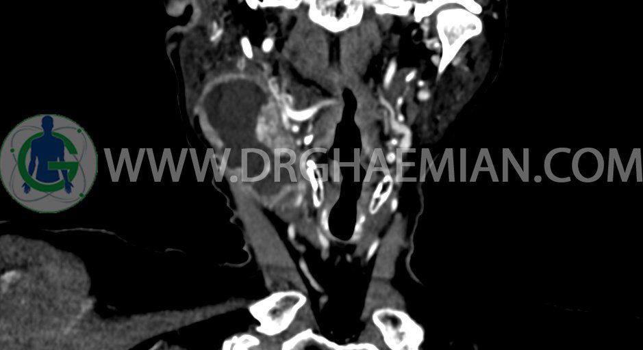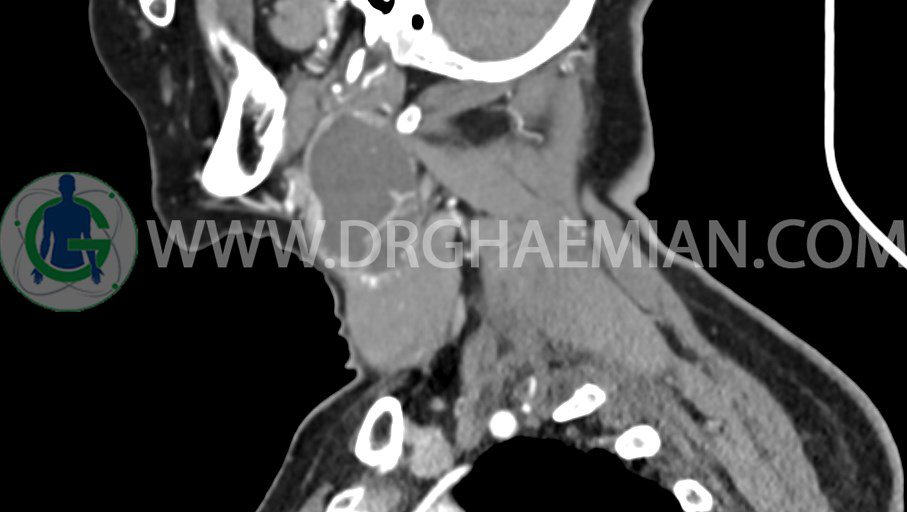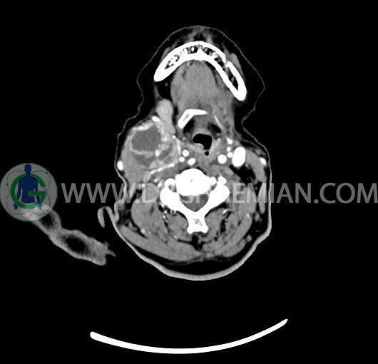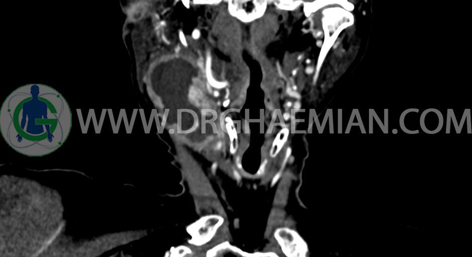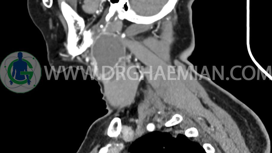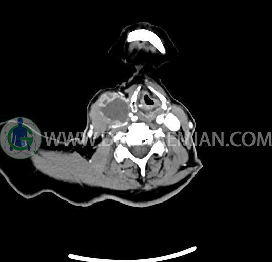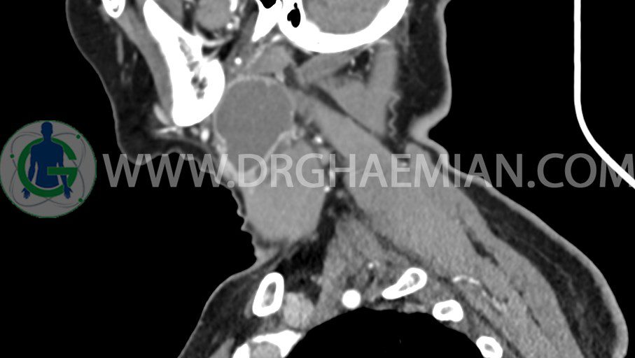 سی تی اسکن گردن یک روش تصویربرداری است که با استفاده از تشعشعات تصاویری با جزییات از ناحیه خالی گردن ایجاد میکند. در این کیس توده سیستیک گردن به ابعاد mm 33 x 36 x 70، لنفادنوپاتی نکروزه، نشانه های جراحی در طرف راست زبان و کاهش انحنای گردن به همراه اسکولیوزیس و تغییرات DJD در محره های C3/C4/C5/C6/C7 دیده می شود.