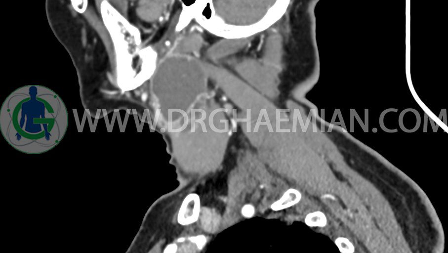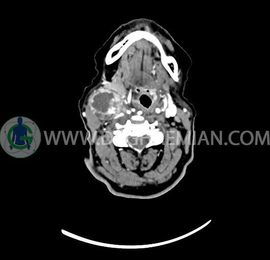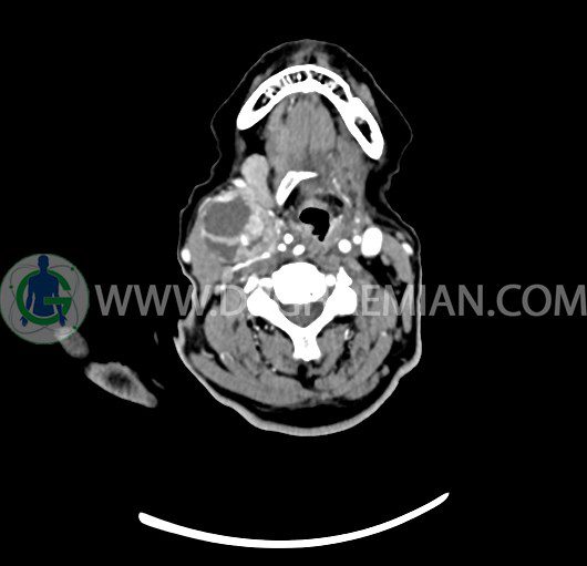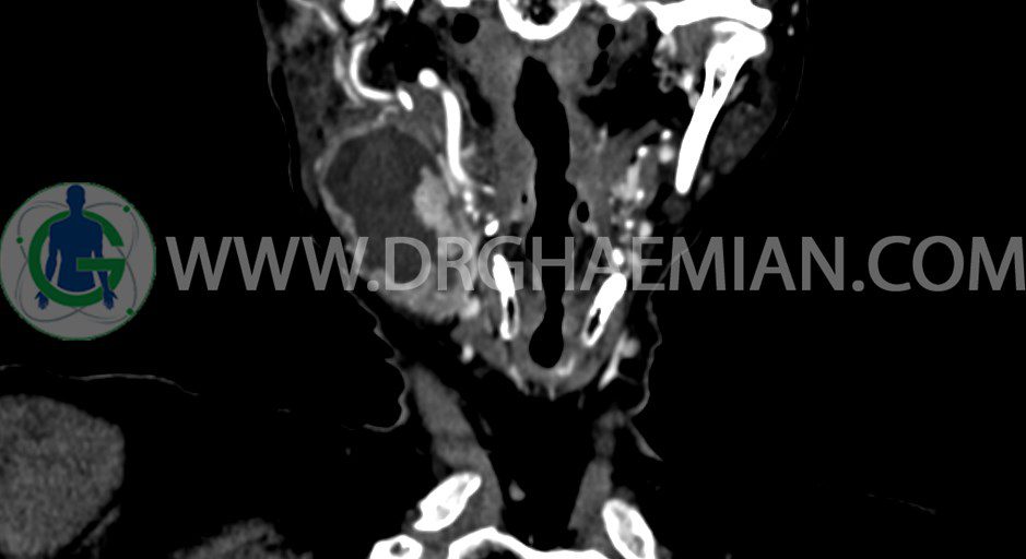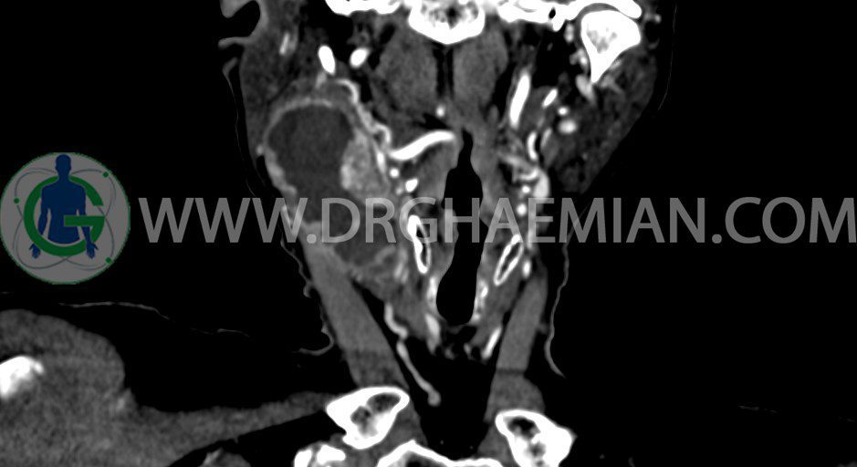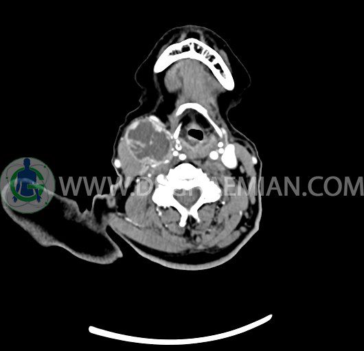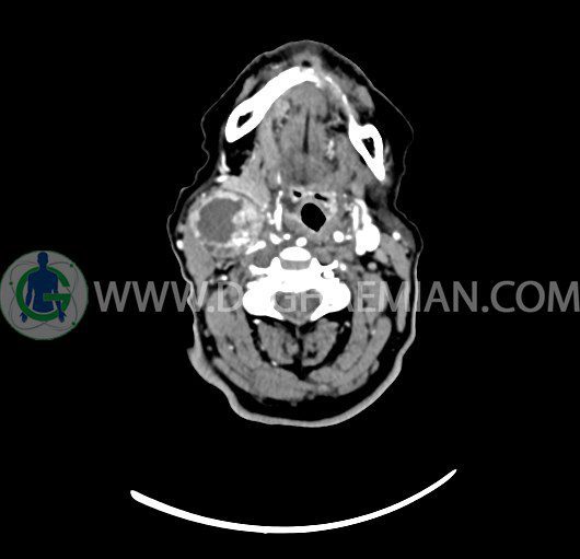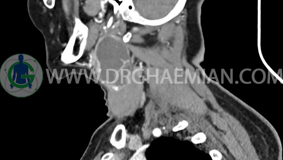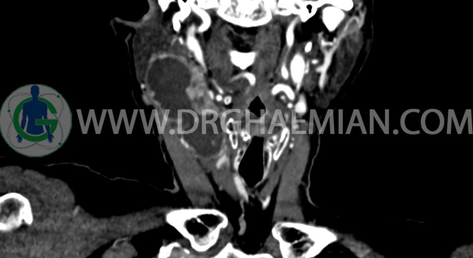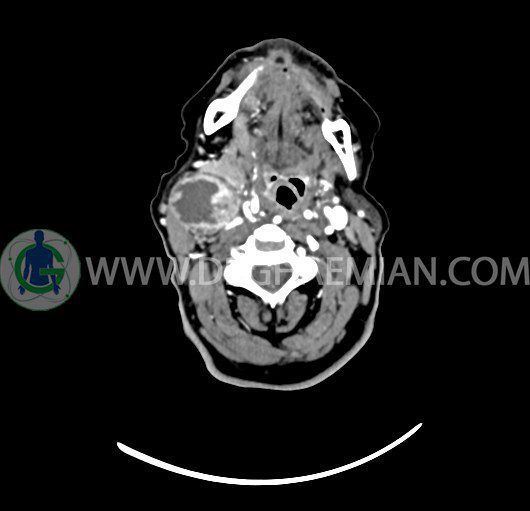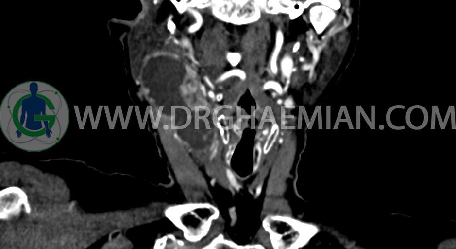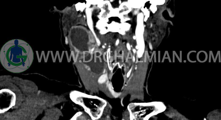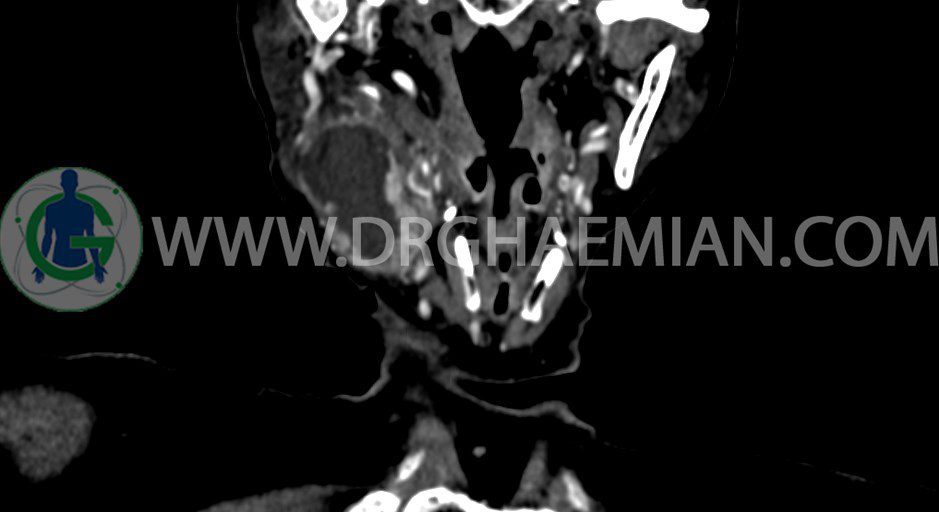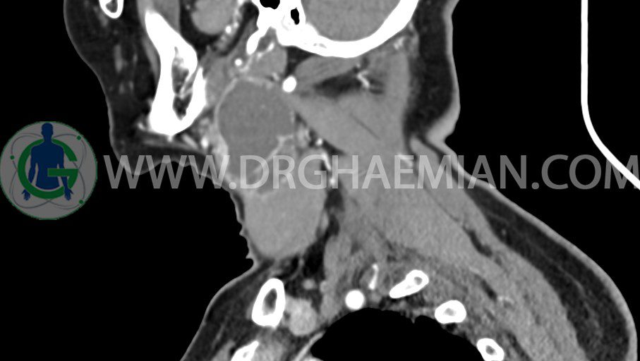 سی تی اسکن گردن یک روش تصویربرداری است که با استفاده از تشعشعات تصاویری با جزییات از ناحیه خالی گردن ایجاد میکند. در این کیس توده سیستیک گردن به ابعاد mm 33 x 36 x 70، لنفادنوپاتی نکروزه، نشانه های جراحی در طرف راست زبان و کاهش انحنای گردن به همراه اسکولیوزیس و تغییرات DJD در محره های C3/C4/C5/C6/C7 دیده می شود.