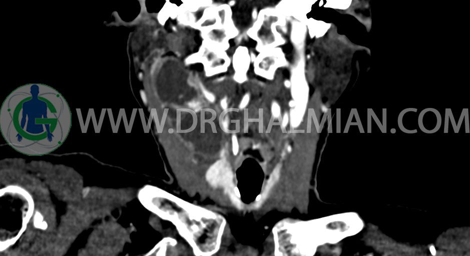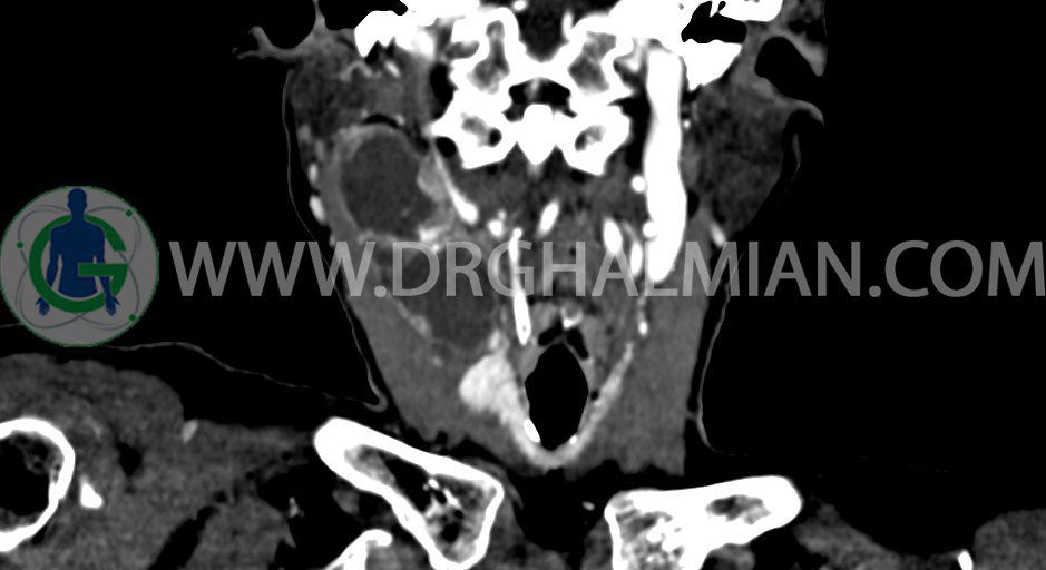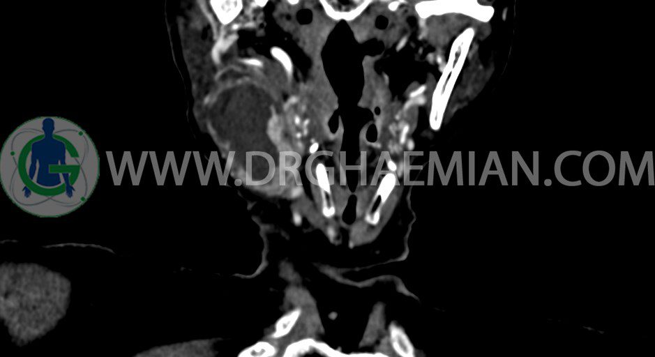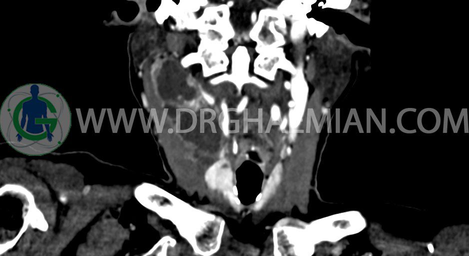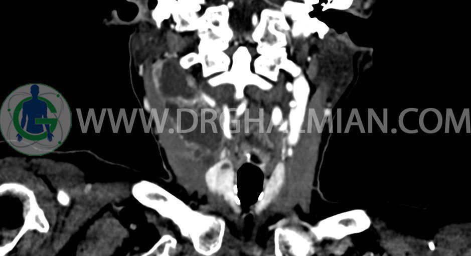 در سي تي اسکن اسپيرال از گردن با تزريق (مولتي ديدکتور 16 با مقاطع ظريف و بازسازي هاي ساژيتال و کرونال):