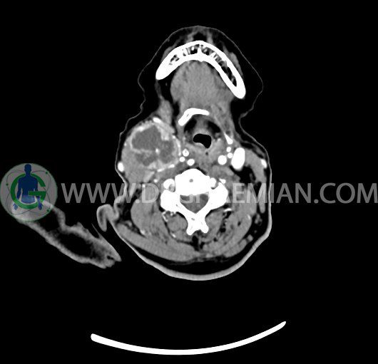 و نامنظم در نواحي محيطي مطرح کننده لنفادنوپاتي نکروزه بدون شواهدي از تهاجم به شريان هاي کاروتيد و