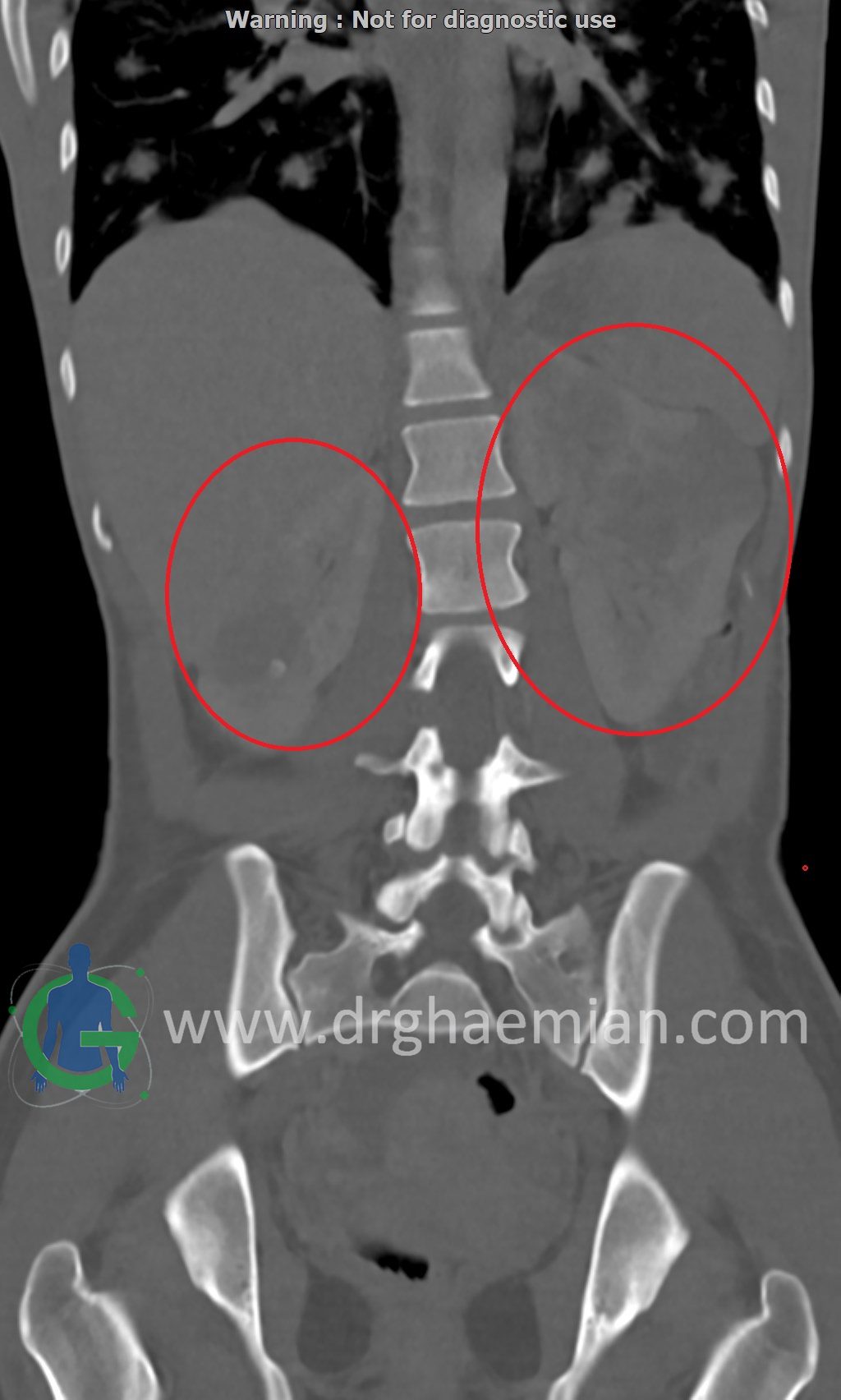 توده های hypoenhancing فراوان به قطر 10mm تا 30mm در کلیه راست و 10mm تا 50mm در کلیه چپ و