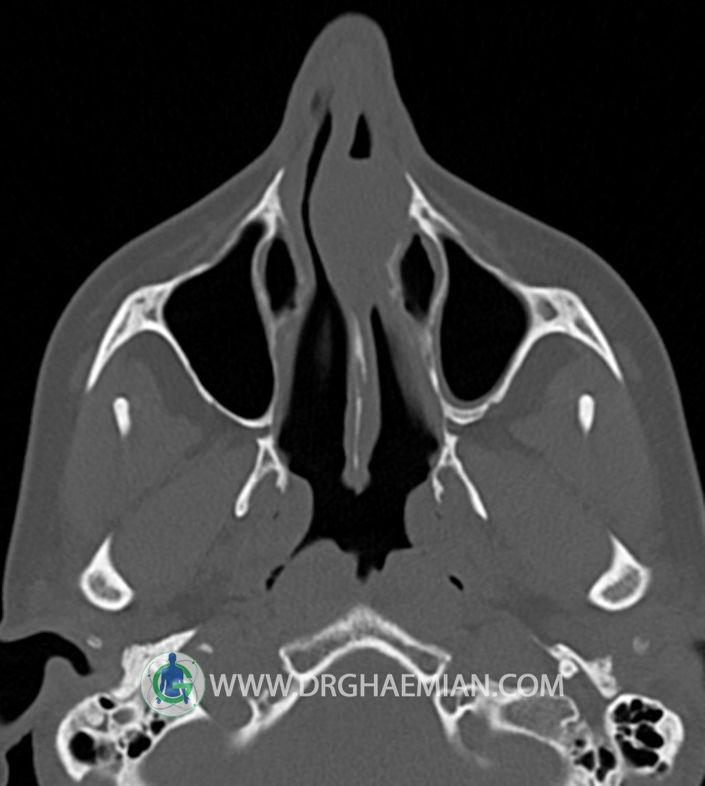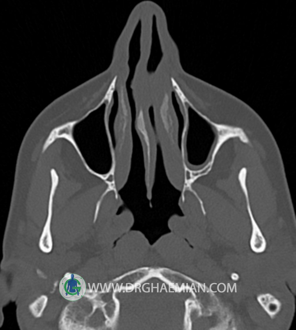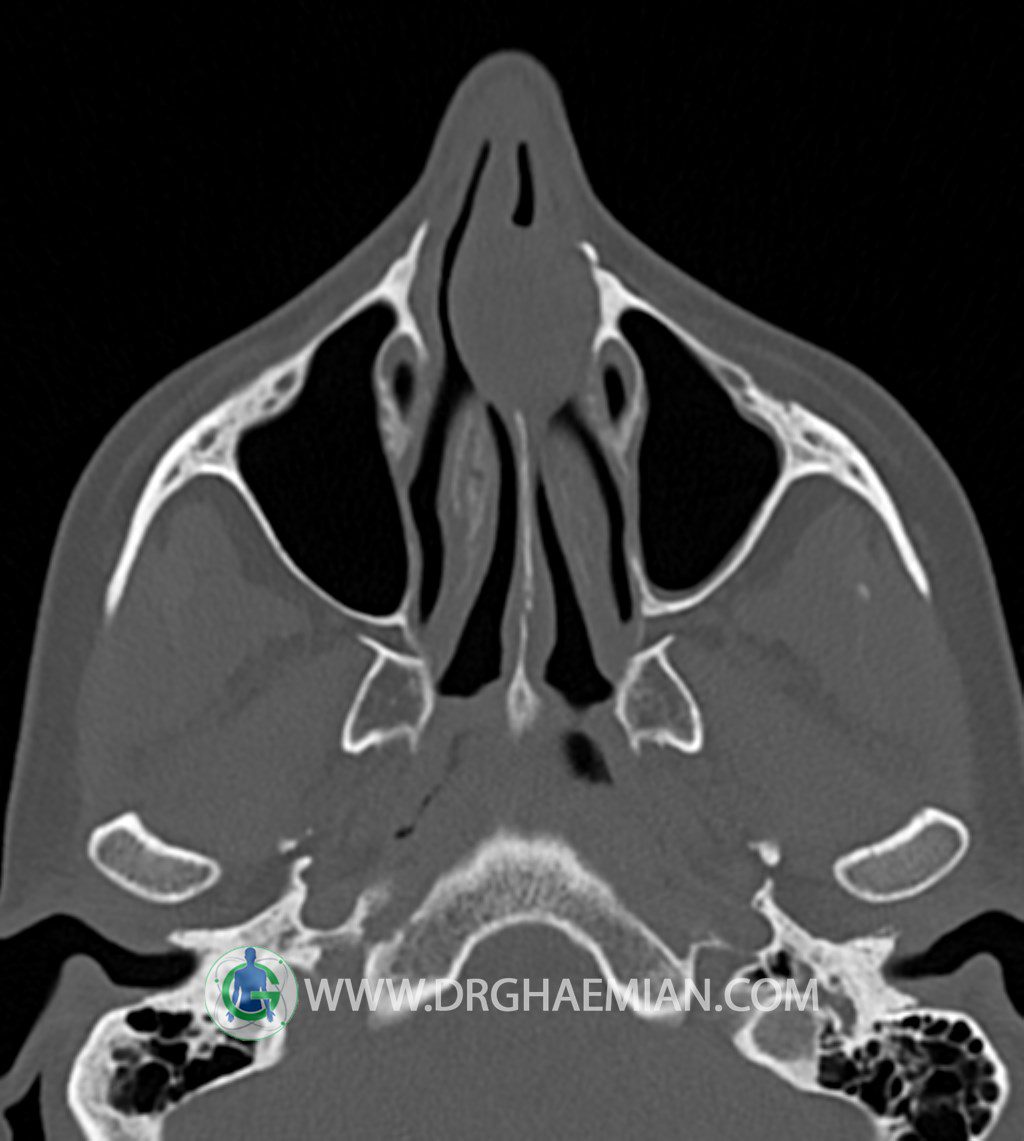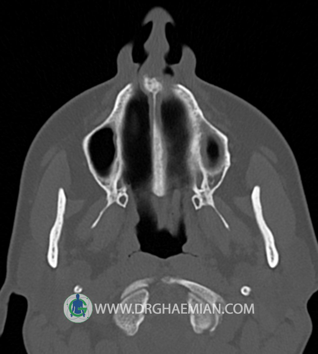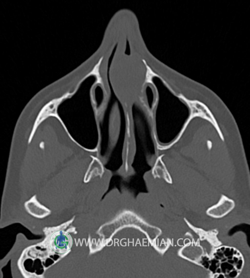 سی تی اسکن سینوس ها یک روش تصویربرداری است که با استفاده از تشعات ایکس تصاویری با جزییات از ناحیه خالی داخل صورت (سینوس ها) ایجاد میکند. در این کیس توده نسج نرم سینوس به ابعاد mm 15 x 25 به همراه انحراف سپتوم و ضخامت مخاطی دیده می شود.