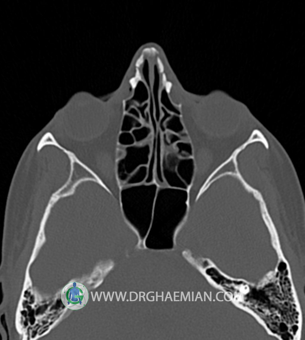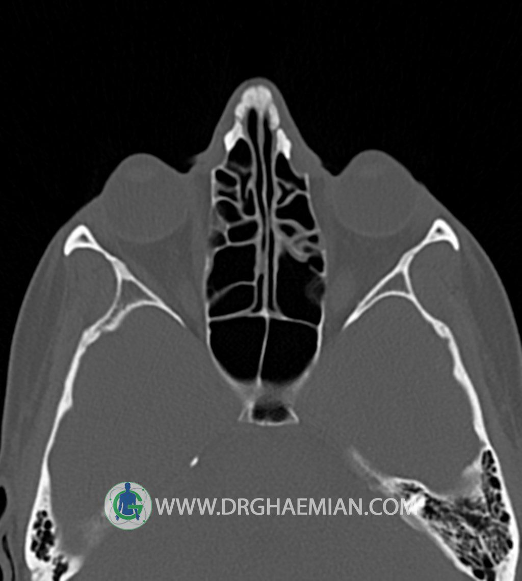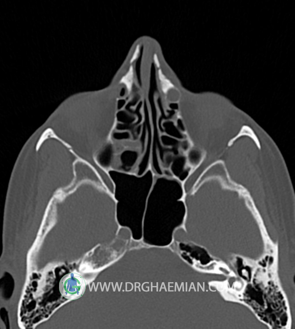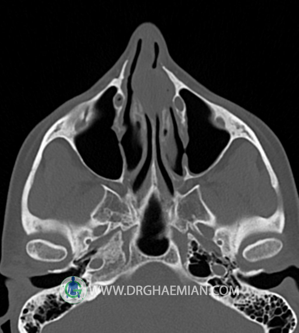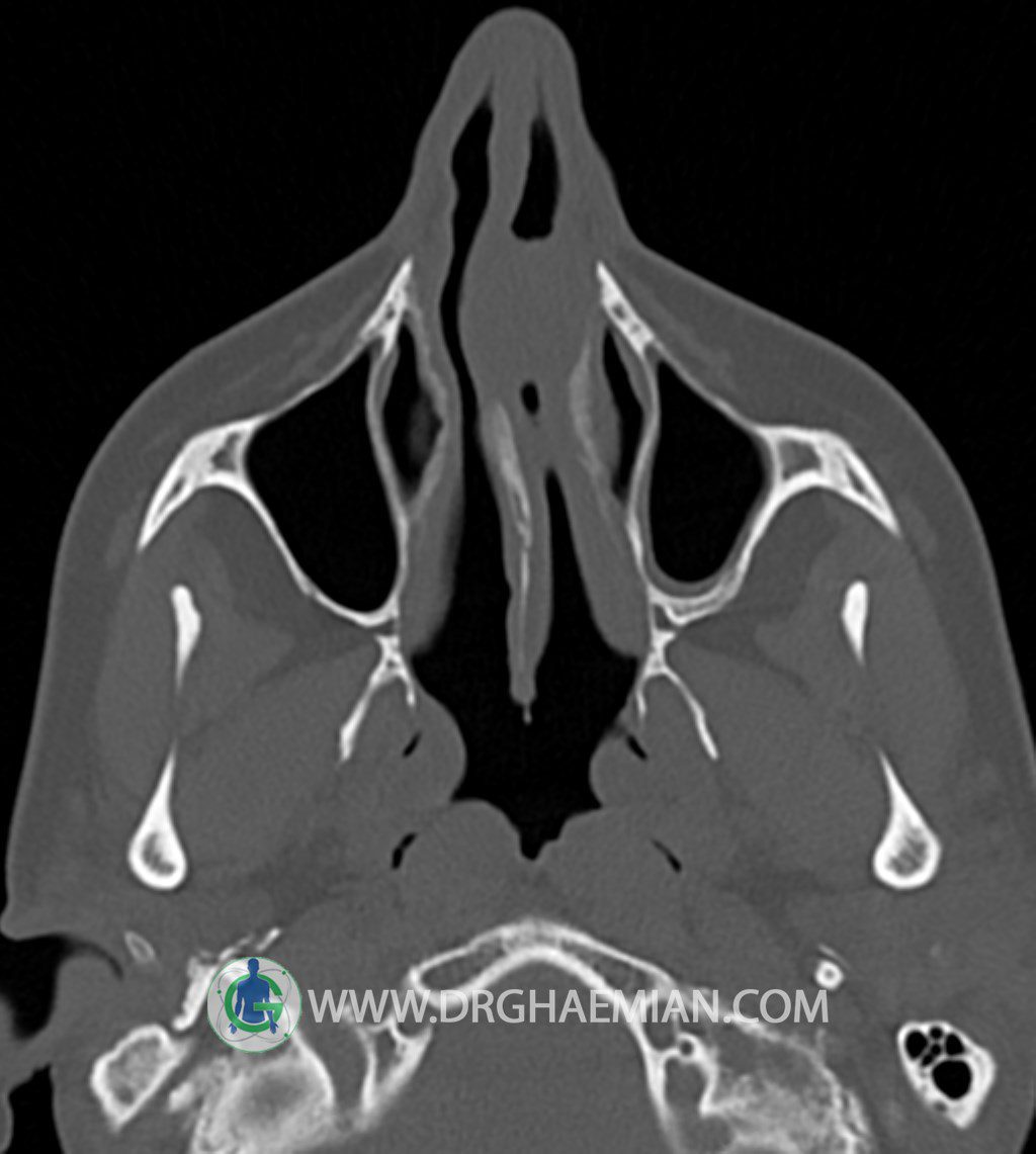 سی تی اسکن سینوس ها یک روش تصویربرداری است که با استفاده از تشعات ایکس تصاویری با جزییات از ناحیه خالی داخل صورت (سینوس ها) ایجاد میکند. در این کیس توده نسج نرم سینوس به ابعاد mm 15 x 25 به همراه انحراف سپتوم و ضخامت مخاطی دیده می شود.