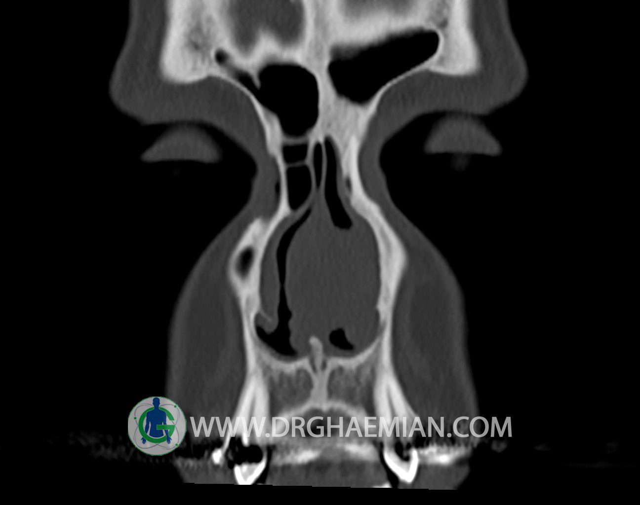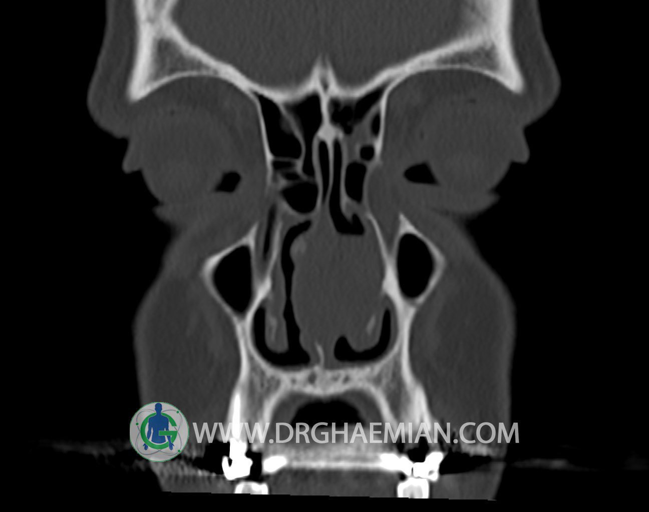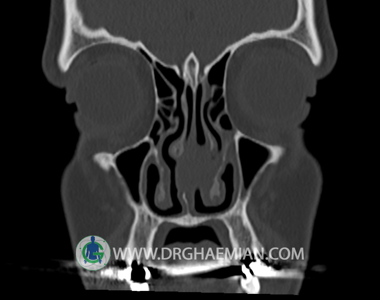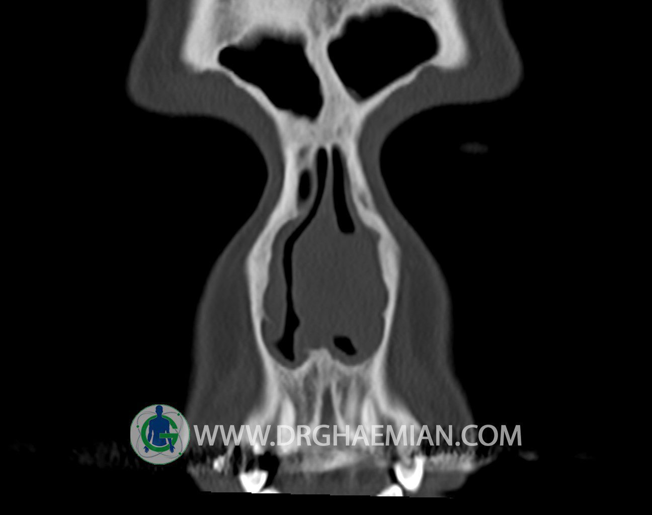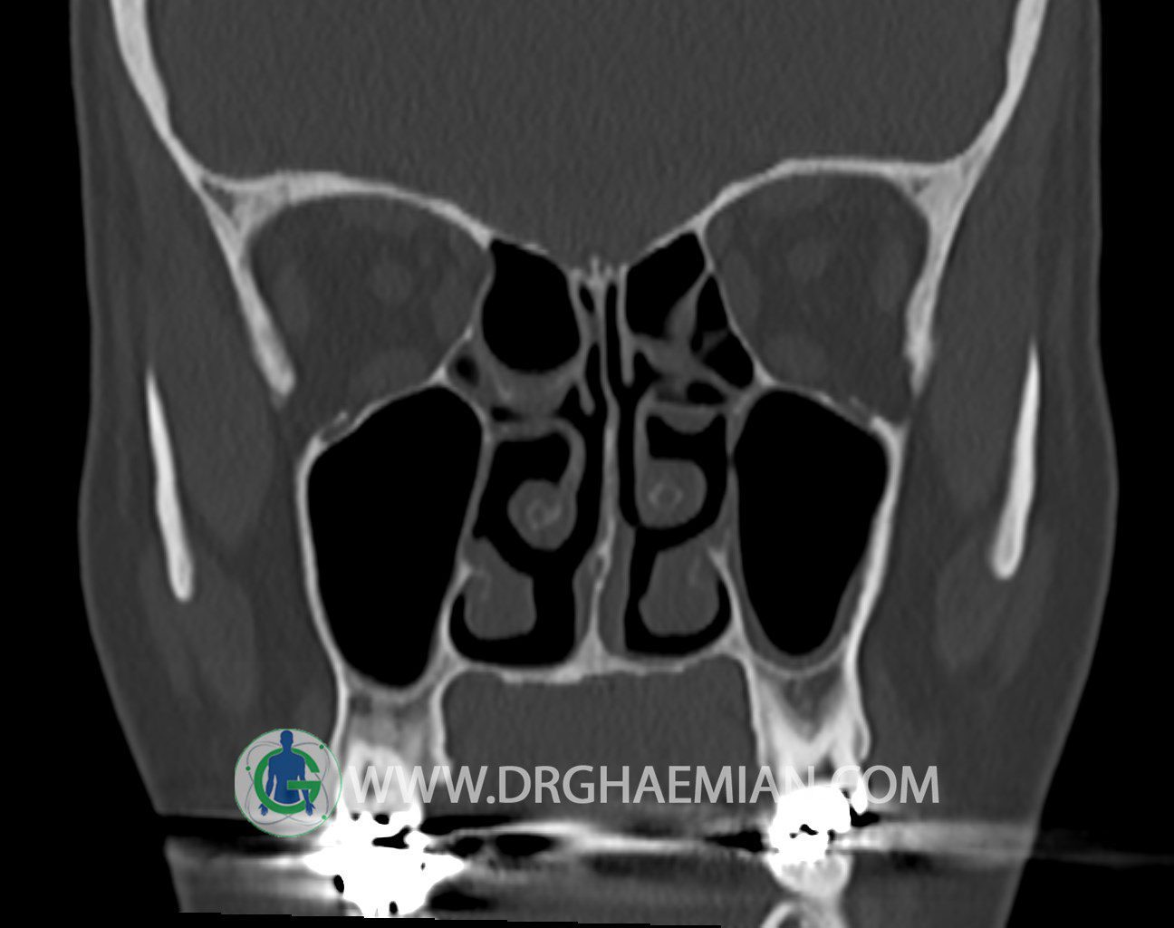 سی تی اسکن سینوس ها یک روش تصویربرداری است که با استفاده از تشعات ایکس تصاویری با جزییات از ناحیه خالی داخل صورت (سینوس ها) ایجاد میکند. در این کیس توده نسج نرم سینوس به ابعاد mm 15 x 25 به همراه انحراف سپتوم و ضخامت مخاطی دیده می شود.