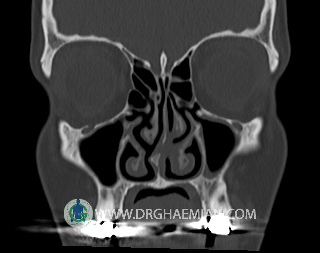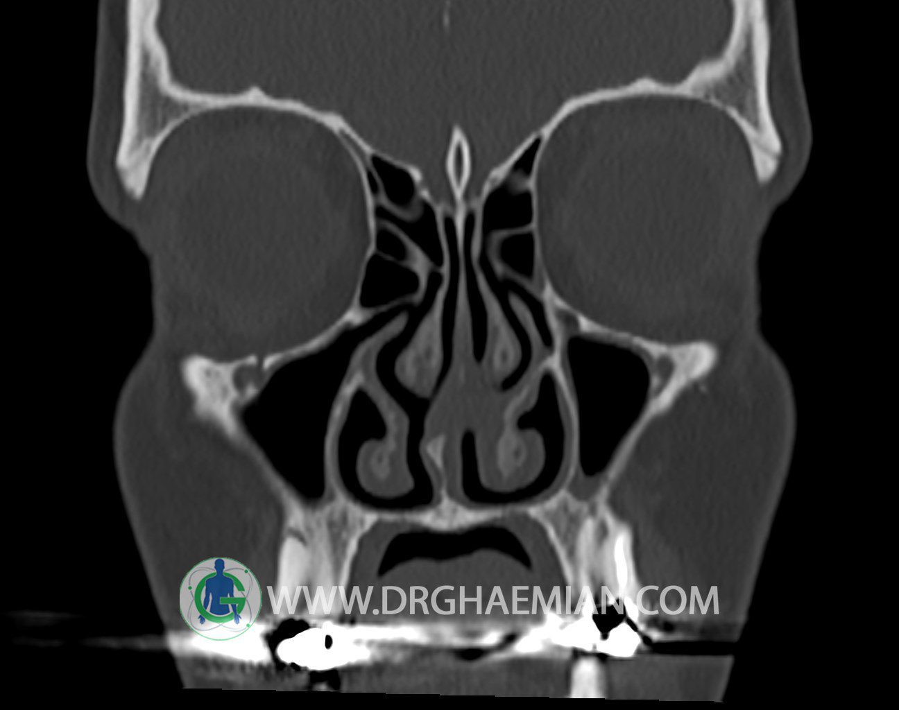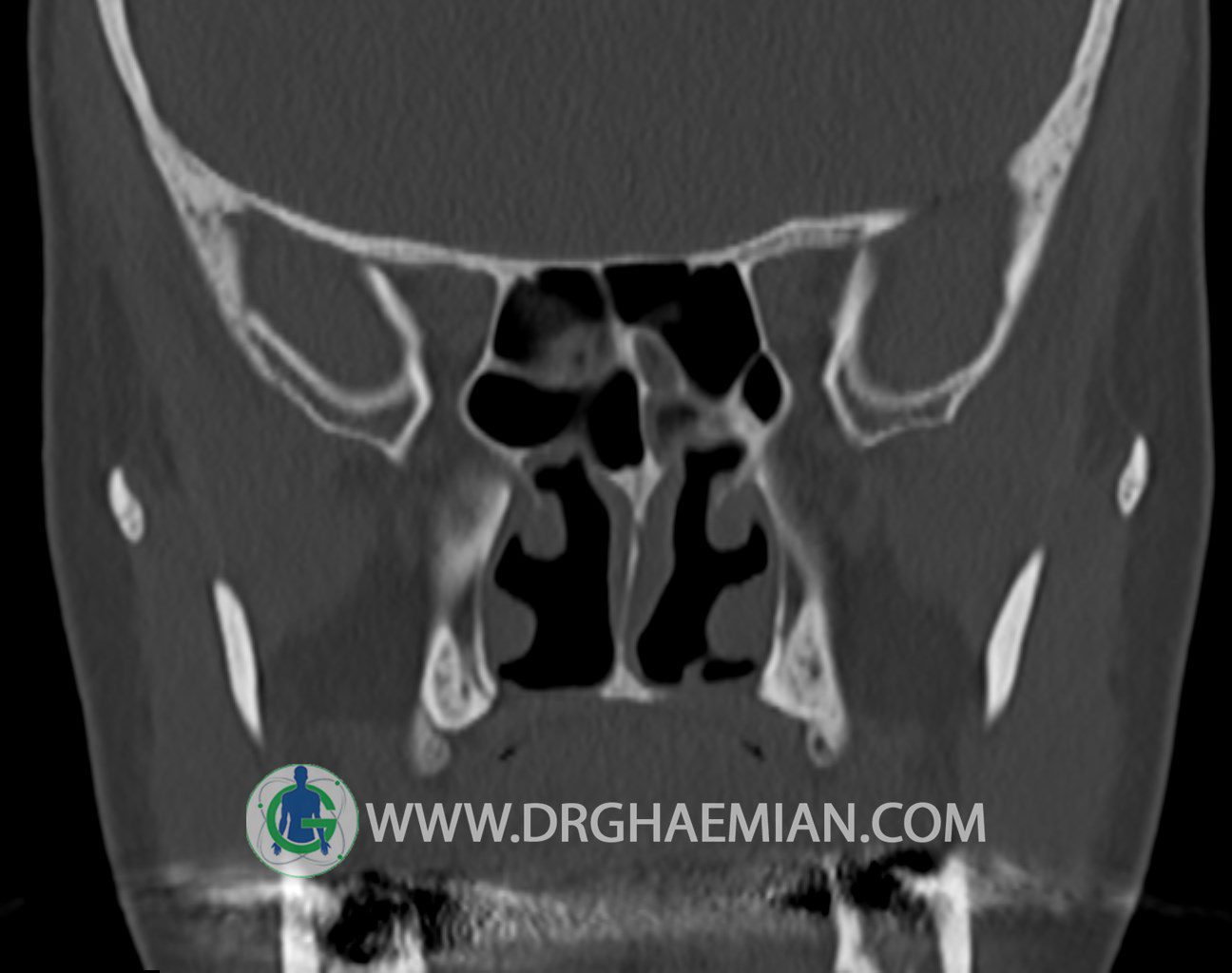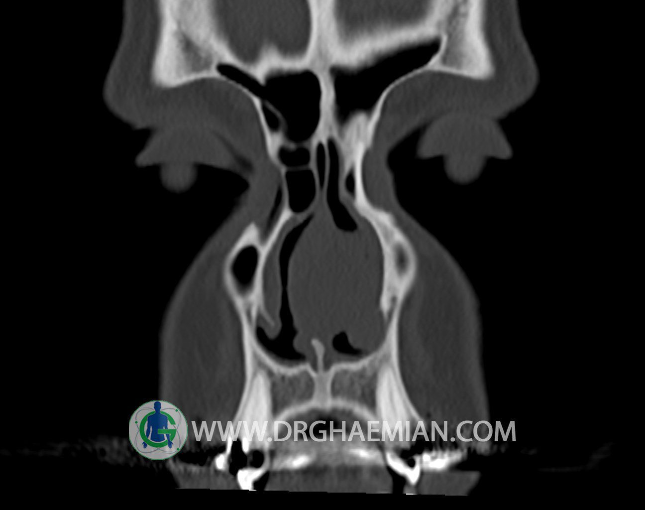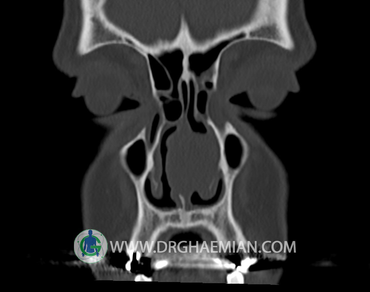 سی تی اسکن سینوس ها یک روش تصویربرداری است که با استفاده از تشعات ایکس تصاویری با جزییات از ناحیه خالی داخل صورت (سینوس ها) ایجاد میکند. در این کیس توده نسج نرم سینوس به ابعاد mm 15 x 25 به همراه انحراف سپتوم و ضخامت مخاطی دیده می شود.