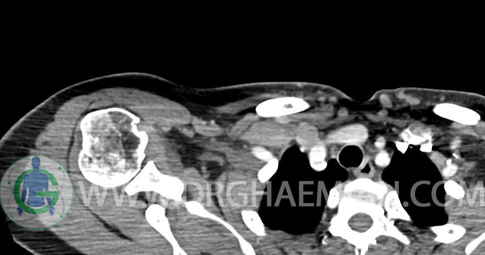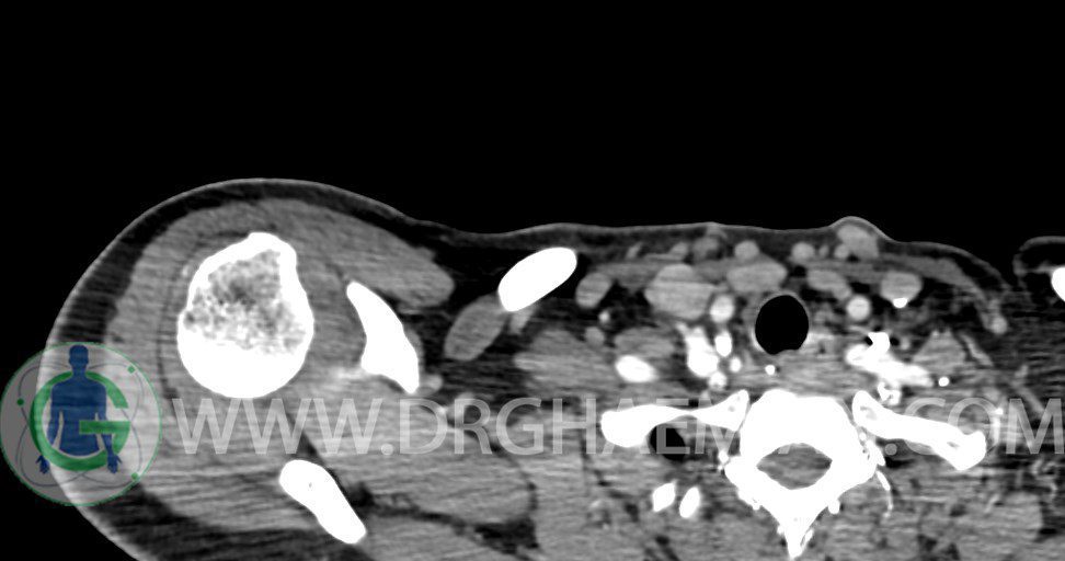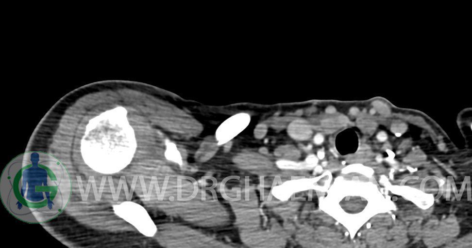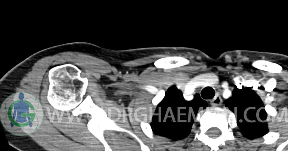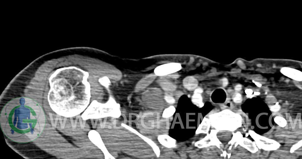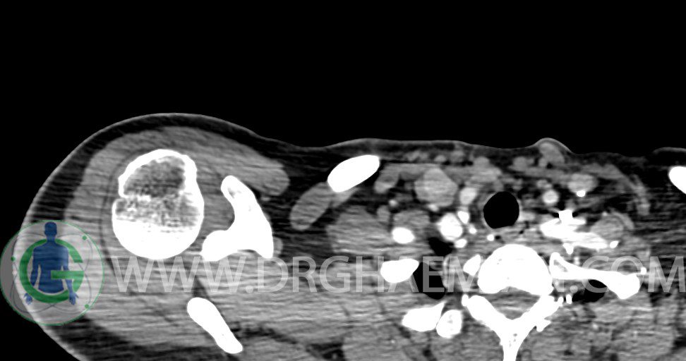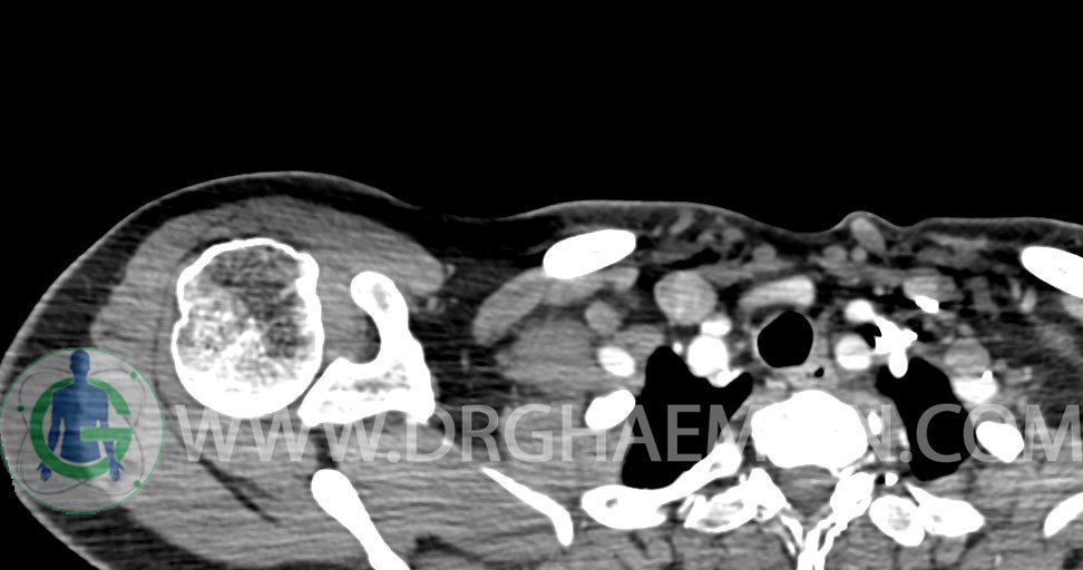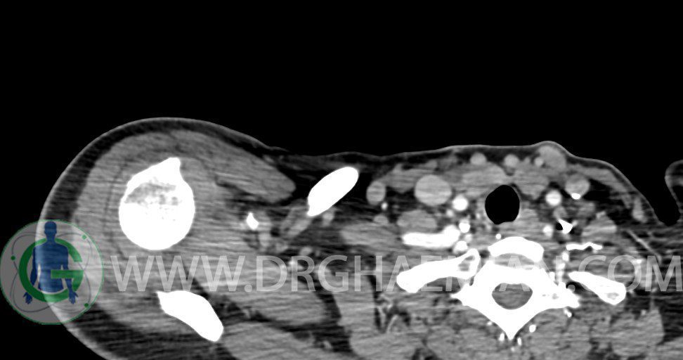– توده نسج نرمي دوکي شکل با حدود واضح به ابعاد mm 22 x 25 x 35 در ناحيه سوپراکلاويکل راست، پوستروسوپريور به عروق ساب کلاوين ، مجاور اعصاب شبکه براکيال مطرح کننده توده نوروژنيک مشهود است .
