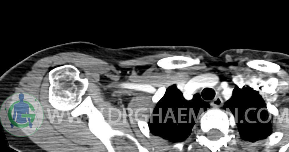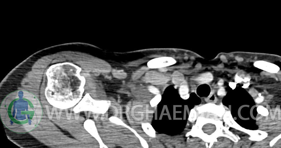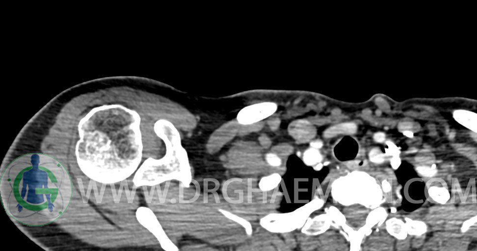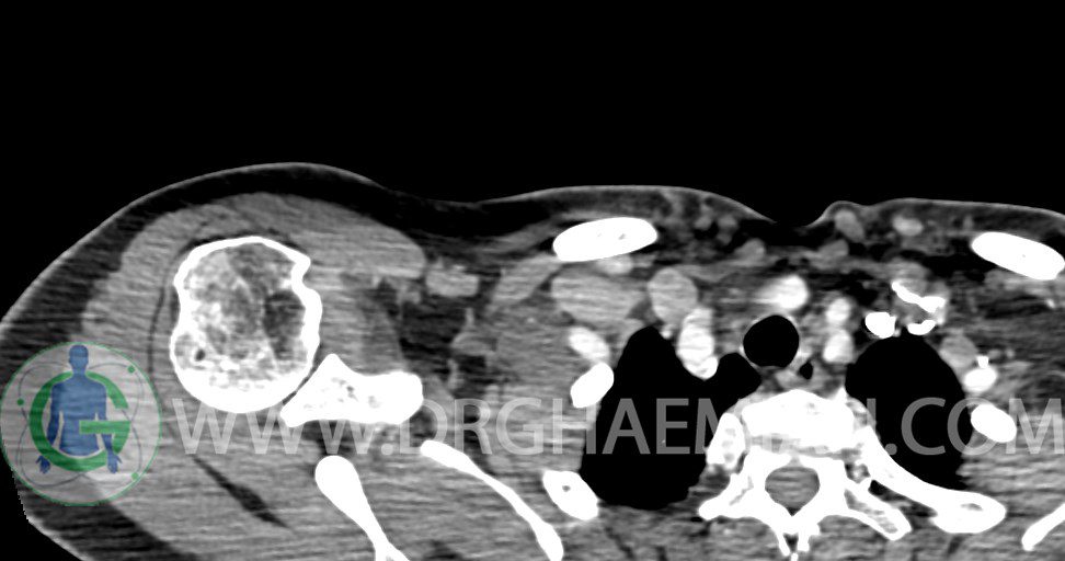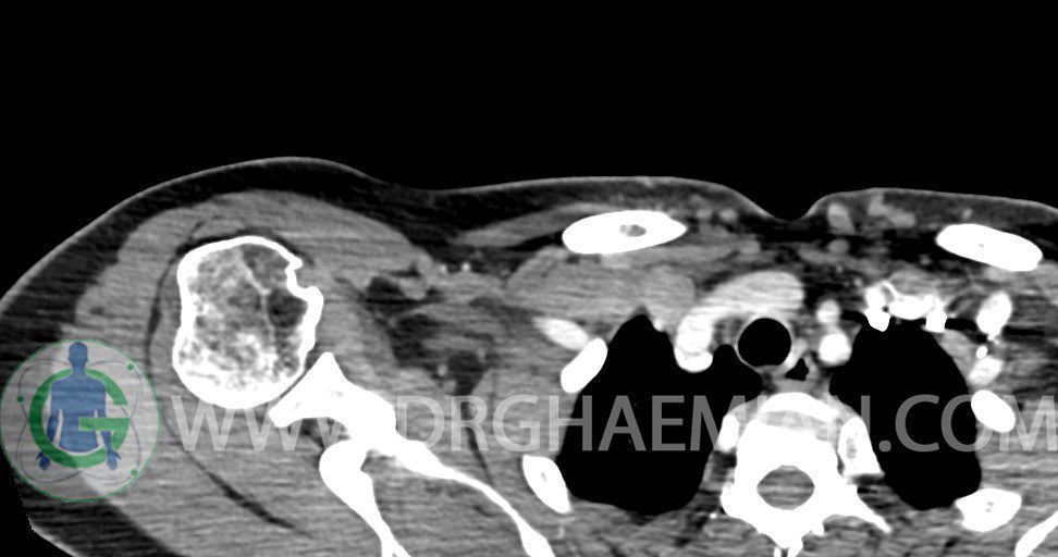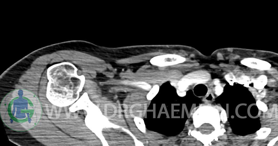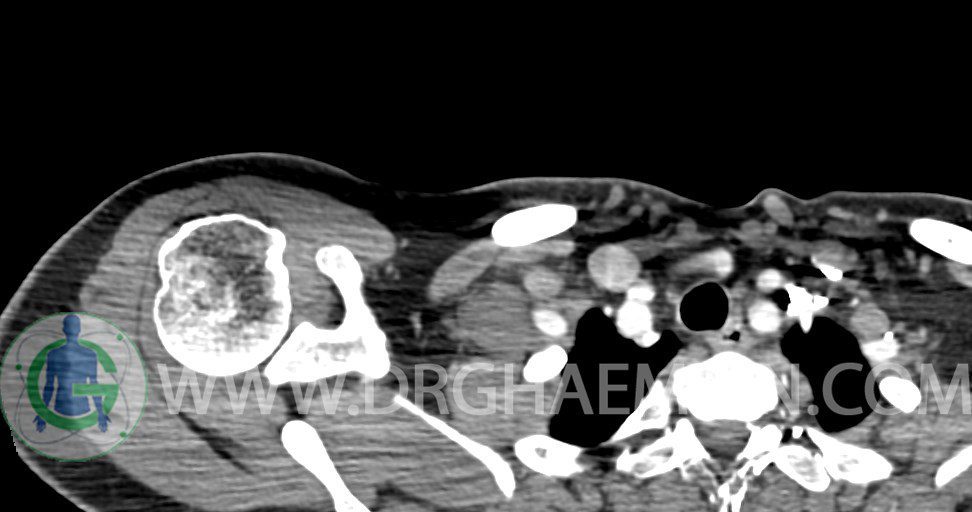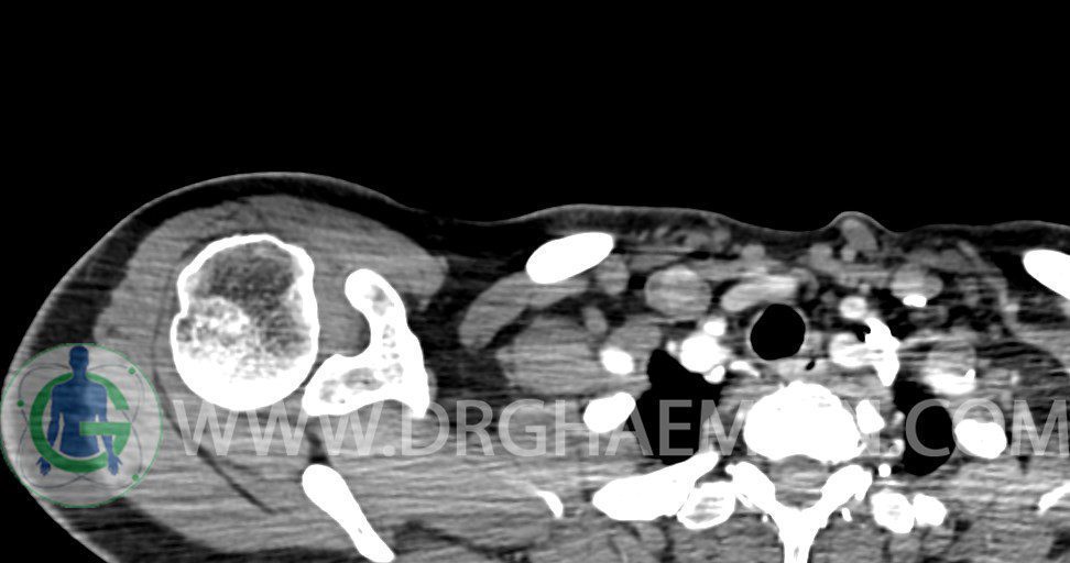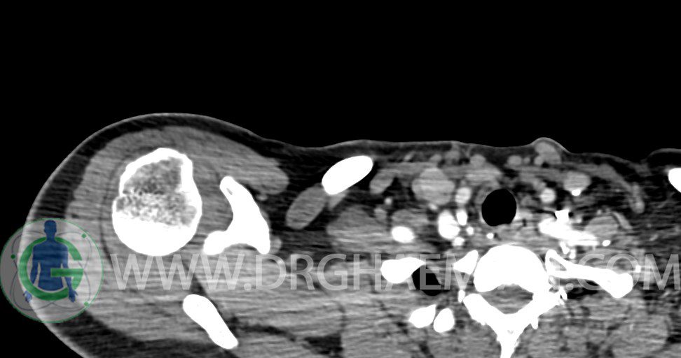 – توده نسج نرمي دوکي شکل با حدود واضح به ابعاد mm 22 x 25 x 35 در ناحيه سوپراکلاويکل راست، پوستروسوپريور به عروق ساب کلاوين ، مجاور اعصاب شبکه براکيال مطرح کننده توده نوروژنيک مشهود است .