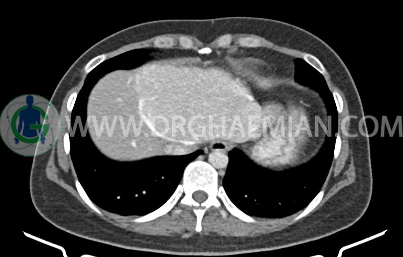 سی تی اسکن شکم و لگن با استفاده از تشعشعات تصاویر عرضی از ناحیه شکمی ایجاد میکند. در این کیس توده بزرگ کبدی به ابعاد 70 در 130 میلی متر، ساختمان سیستیک مولتی لوکوله در ادنکس چپ و ساختمان سیستیک در تخمدان راست مشاهده می شود.