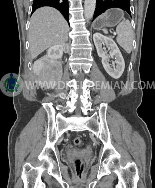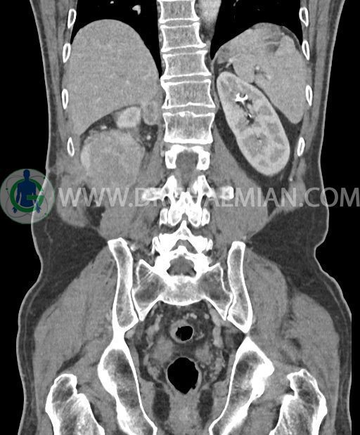 در پل تحتانی کلیه راست رویت شد که به ورای فاشیای Gerota گسترش داشته و به عضلات جدار شکم در این