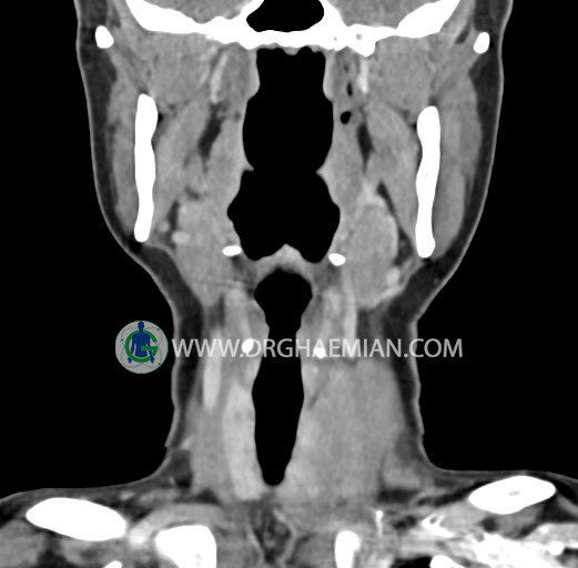 سی تی اسکن ستون فقرات یک روش تصویربرداری است که با استفاده از تشعات ایکس تصاویری با جزییات از ناحیه خالی گردن ایجاد میکند. در این کیس تیروئید بزرگ شده و هتروژن همراه با لنفادنوپاتي دیده می شود.