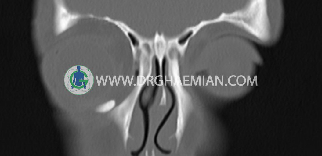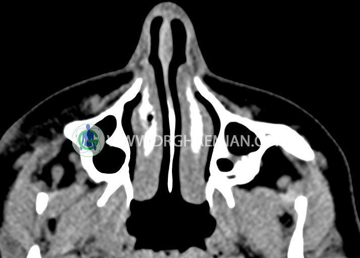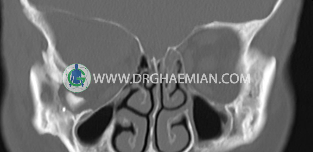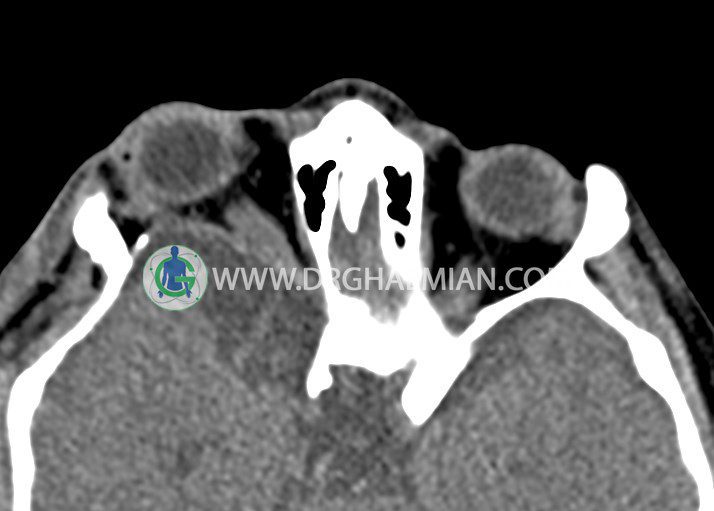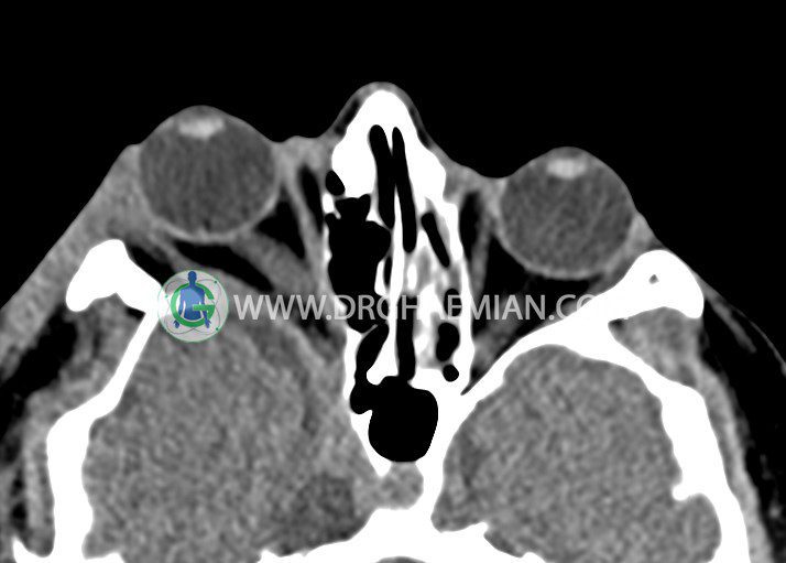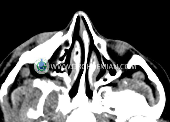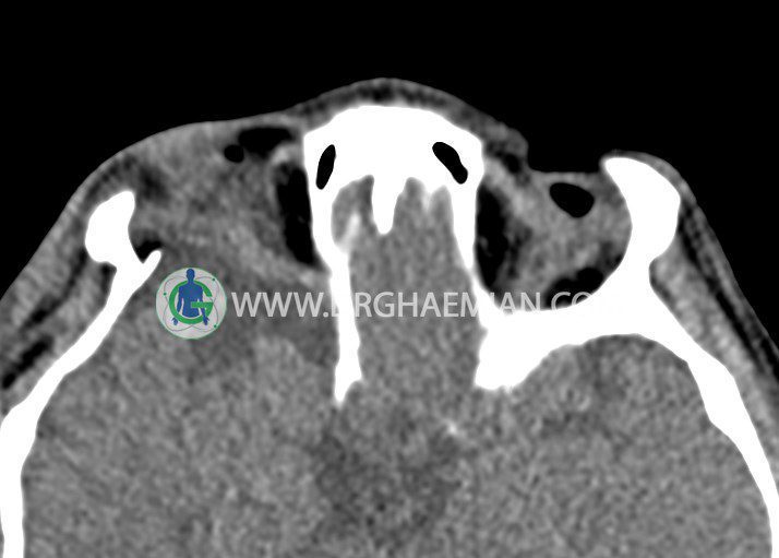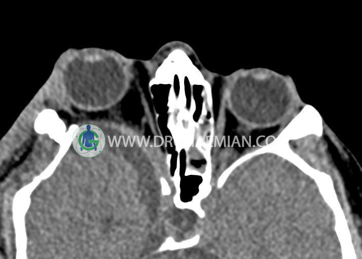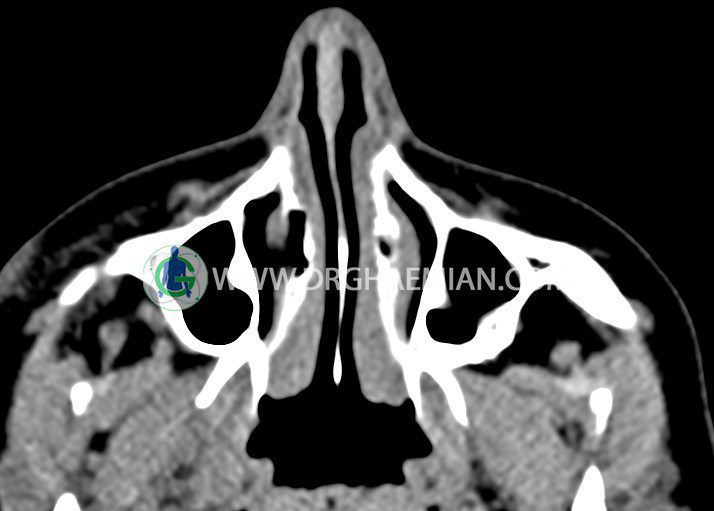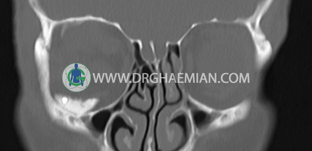 سی تی اسکن اوربیت یک روش تصویربرداری است. این روش از تششعات برای ایجاد تصاویری با جزییات از حفره های چشمی (اوربیت ها)، چشمان و استخوان های پیرامون ایجاد می کند. در این کیس جسم خارجی اوربیت راست به ابعاد mm 5 x 20، انحراف سپتوم و افزایش ضخامت مخاطی سینوس ها مشاهده می شود.