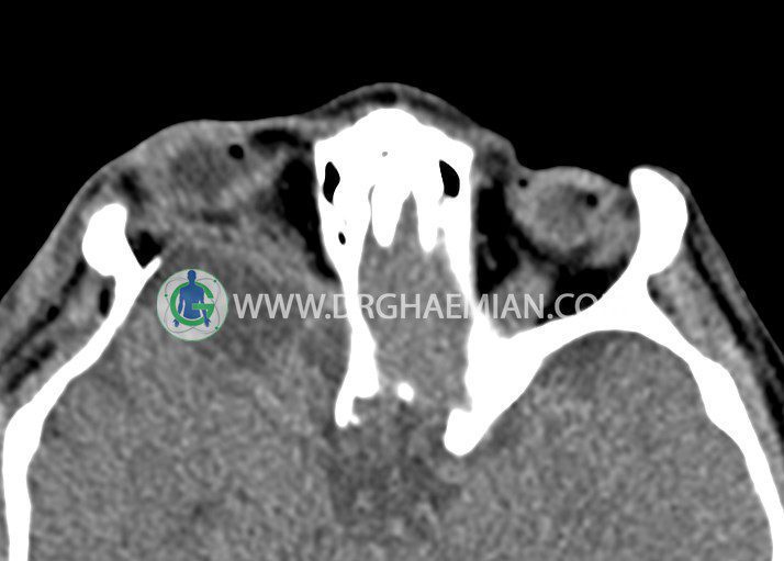 – تورم نسج نرمي در اطراف اربيت و گونه راست مشهود است.