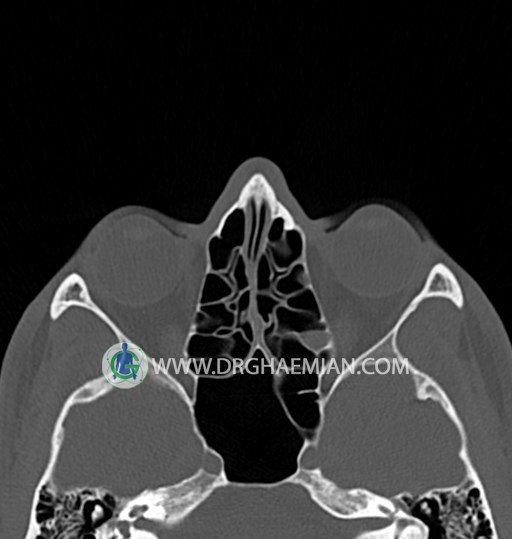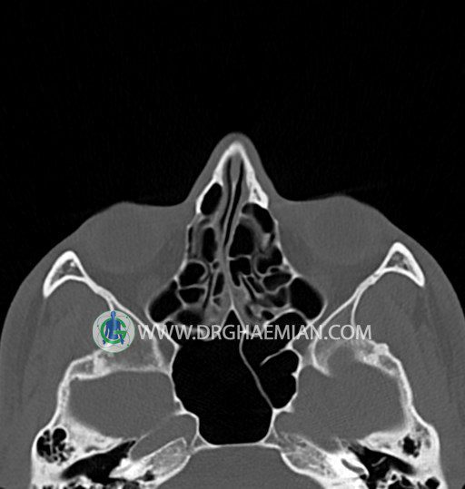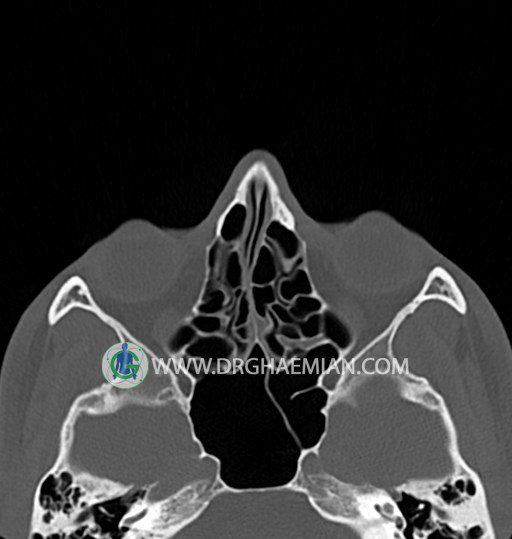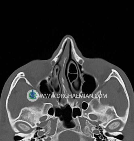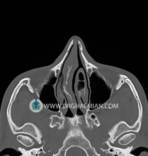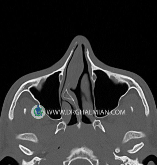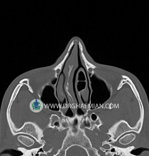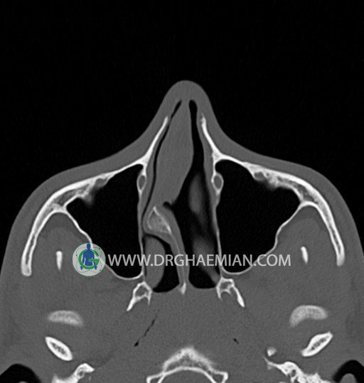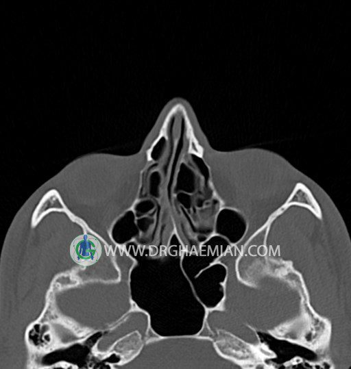سی تی اسکن سینوس ها یک روش تصویربرداری است که با استفاده از تشعات ایکس تصاویری با جزییات از ناحیه خالی داخل صورت (سینوس ها) ایجاد میکند. در این کیس خاراستخوان سینوس به همراه انحراف سپتوم شدید مشاهده می شود.