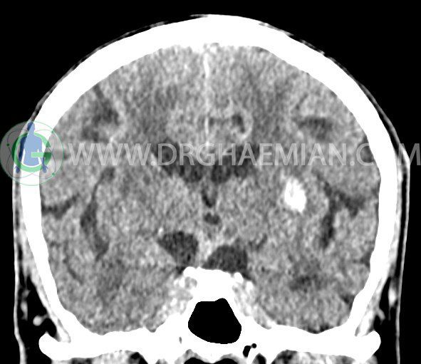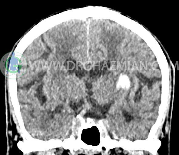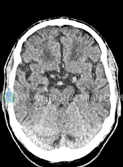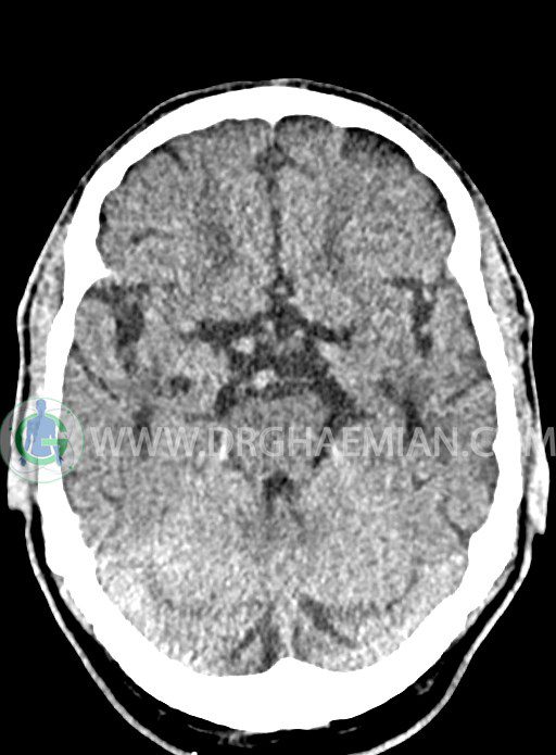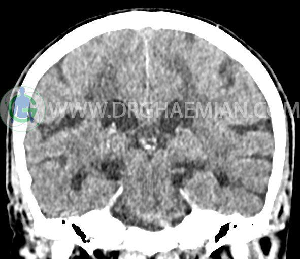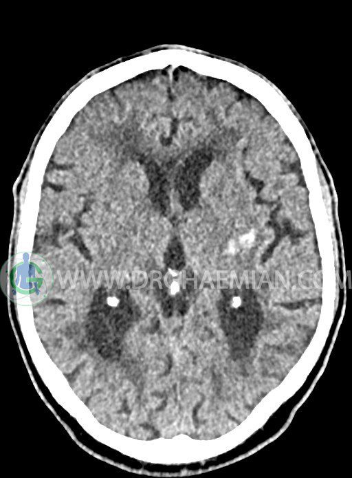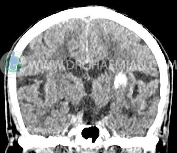 سی تی اسکن مغز با استفاده از اشعات ایکس تصاویری از سر که شامل جمجعه، مغز، حفره های چشمی و سینوس ها است ایجاد می کند. در این کیس خونریزی داخل پارانشیمی و انفارکت هموراژیک، آتروفی خفیف تا متوسط پارانشیم و تغییرات ایسکمیک مشاهده می شود.