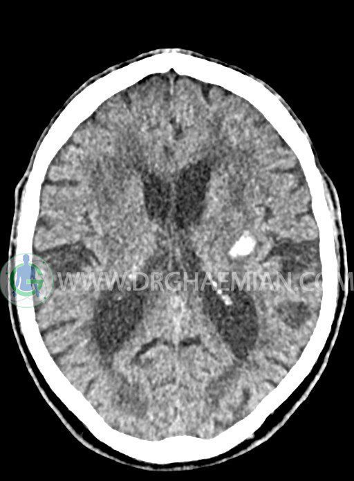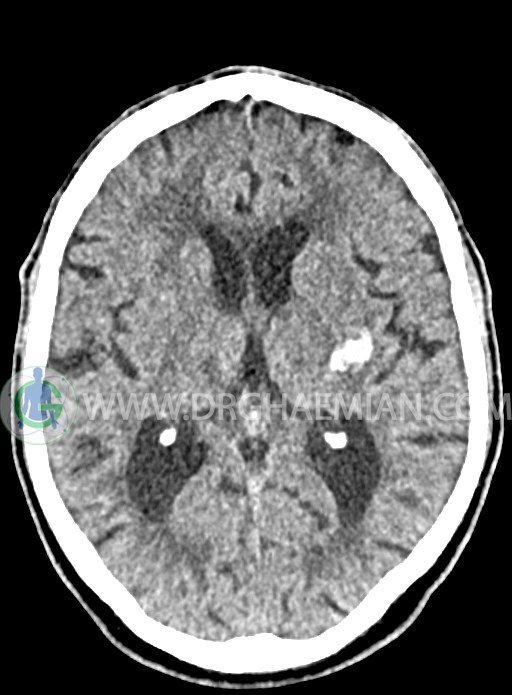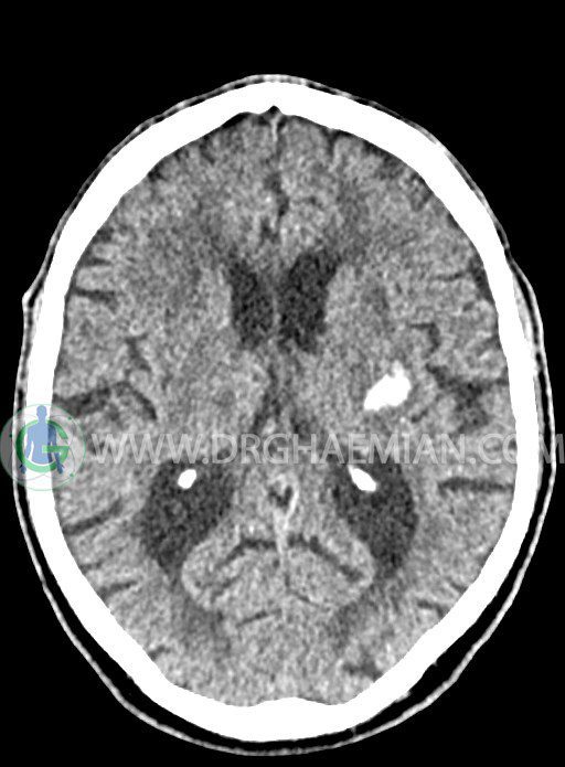 – ضايعه هيپردنس به ابعاد mm 10 x 15 در قسمت خلفي پوتامن – کپسول داخلي چپ مطرح کننده IPH و انفارکت هموراژيک