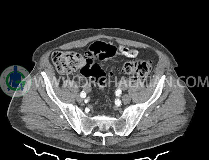– کلسيفيکاسيون ديواره آئورت و شريان ها ايلياک همراه با نشانه هاي ترومبوز مورال در بيفورکاسيون ائورت با امتداد به پروگزيمال هاي شريان هاي ايلياک