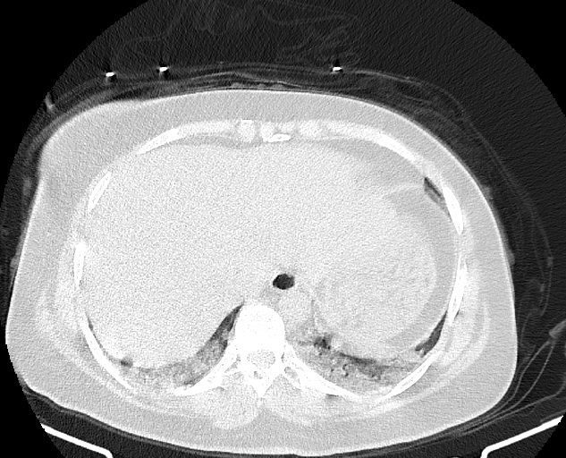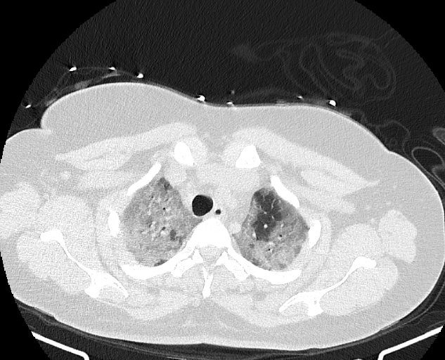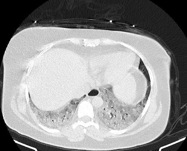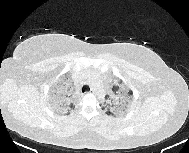 در HRCT از ريه ها(اسپيرال ، مولتي ديتکتور 16، مقاطع اگزيال با ضخامت 1mm بدون فاصله ) ، بدون كنتراست تزريقي :