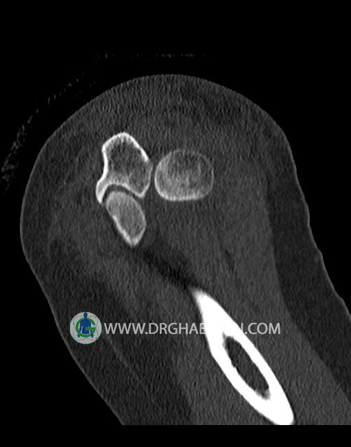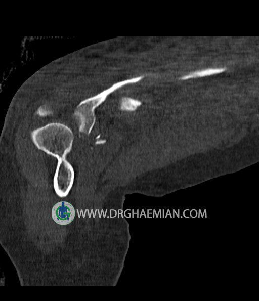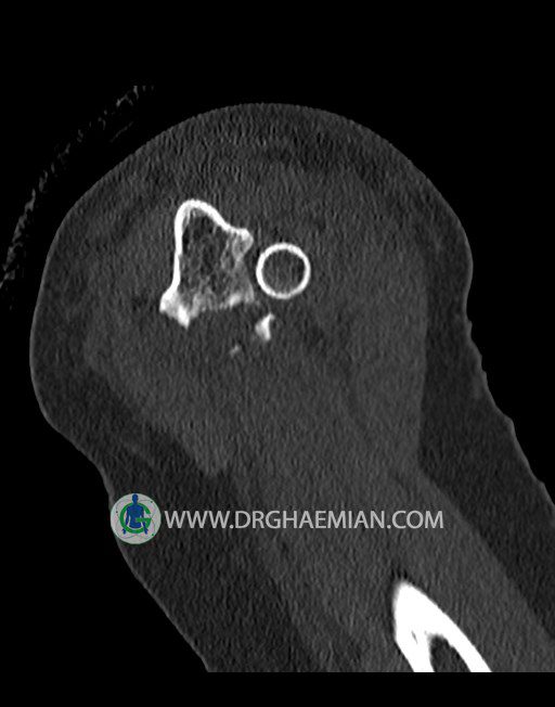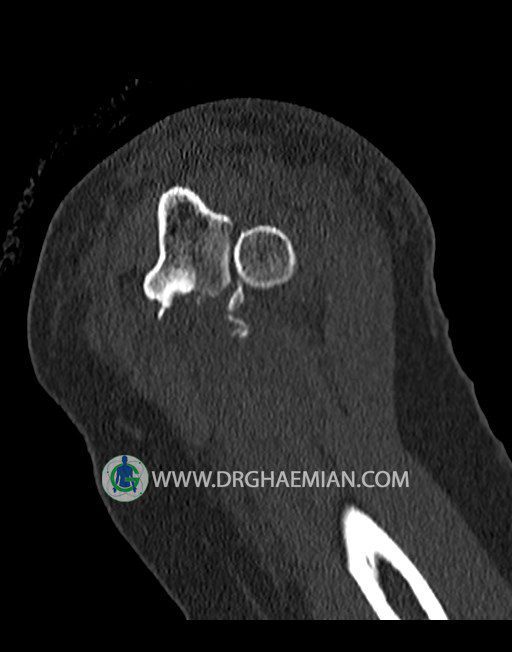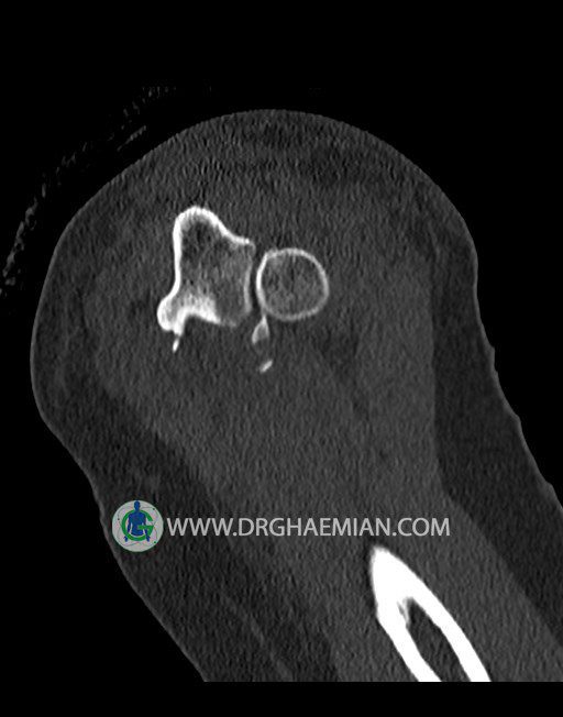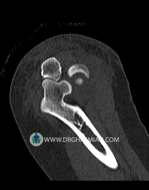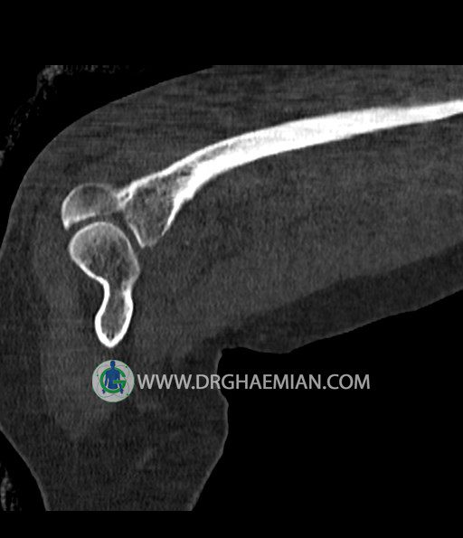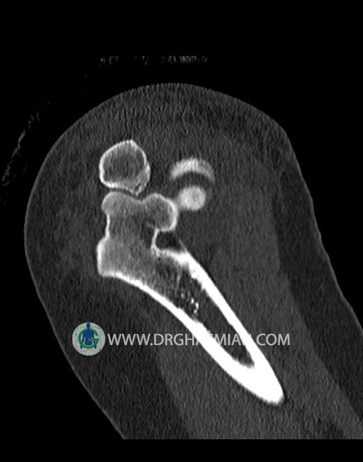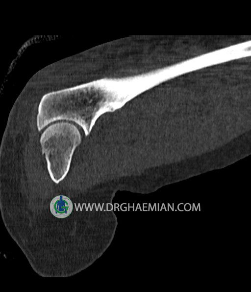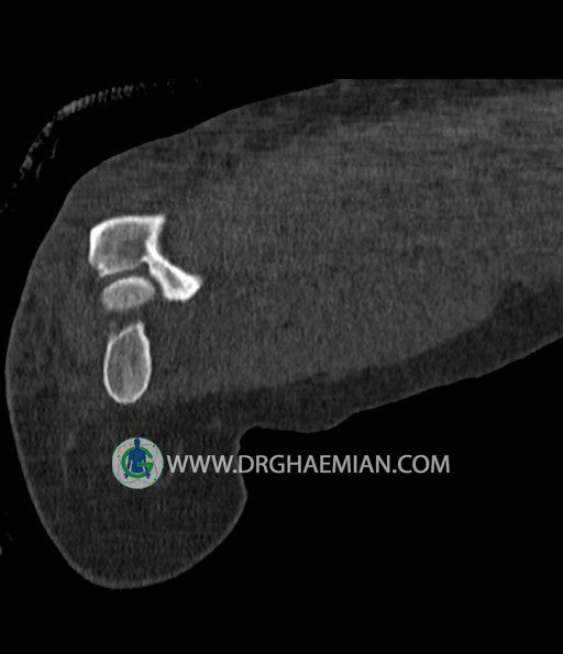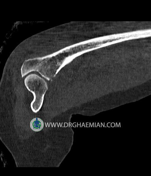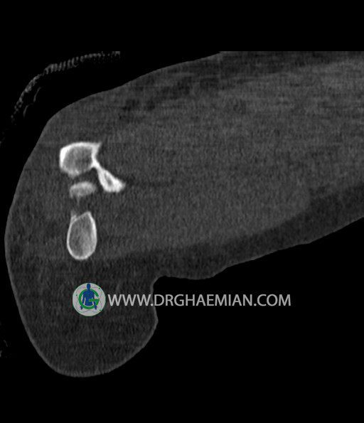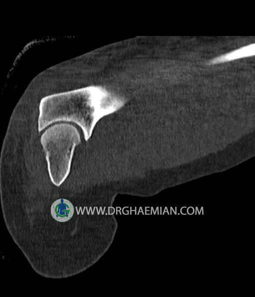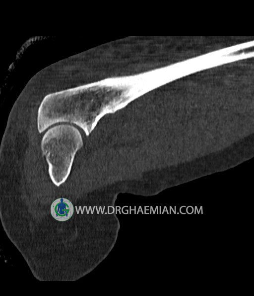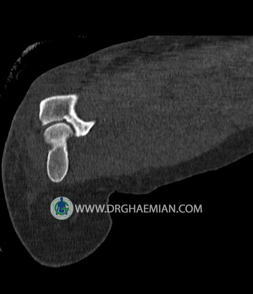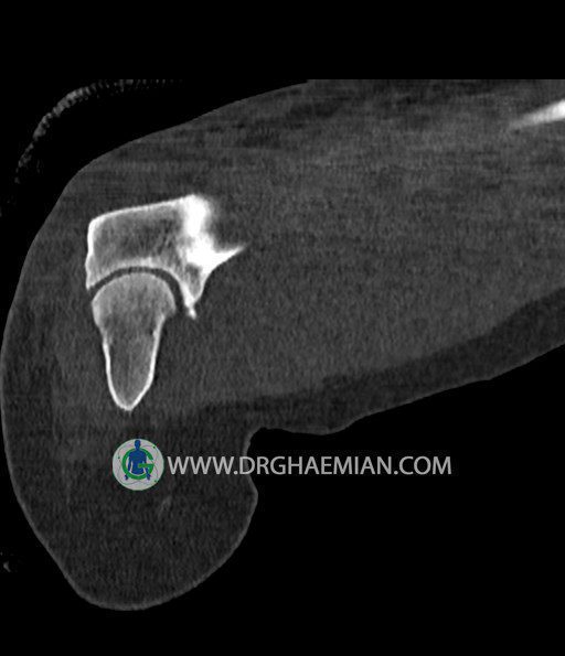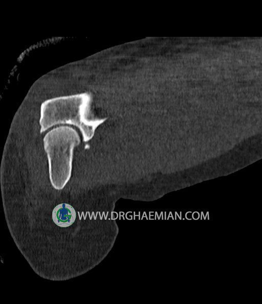 سی تی اسکن آرنج یک روش تصویربرداری است که با استفاده از تششعات ایکس از آرنج تصاویری با جزییات ایجاد می کند. در این کیس زائده منقاری زند زیرین بیمار مشاهده می شود.