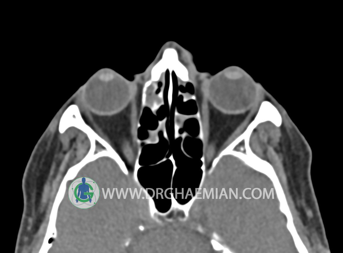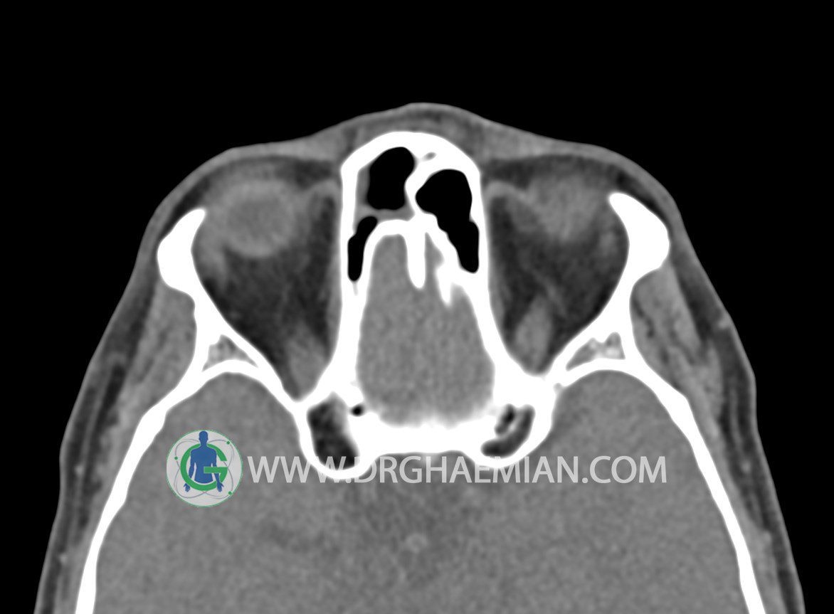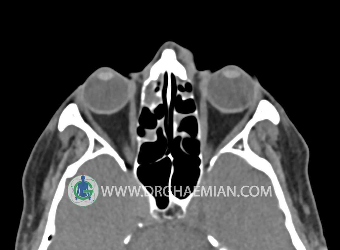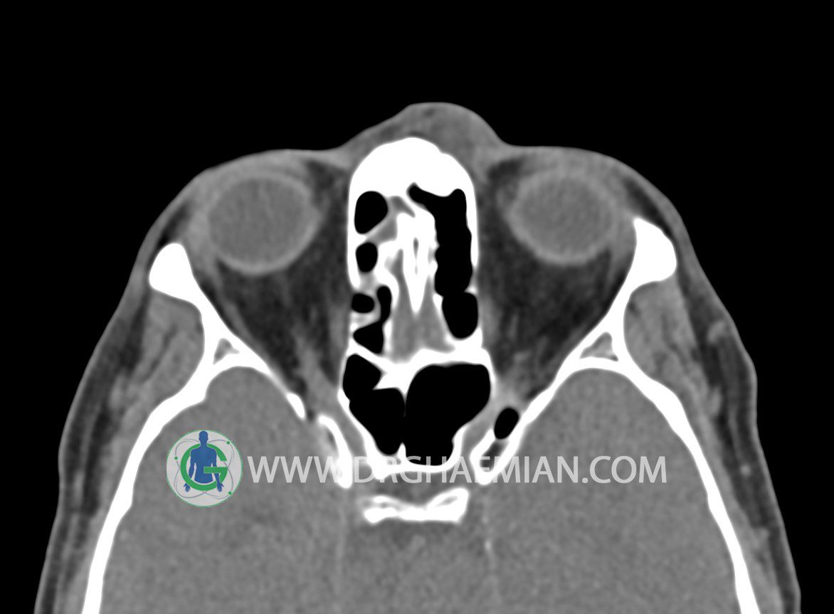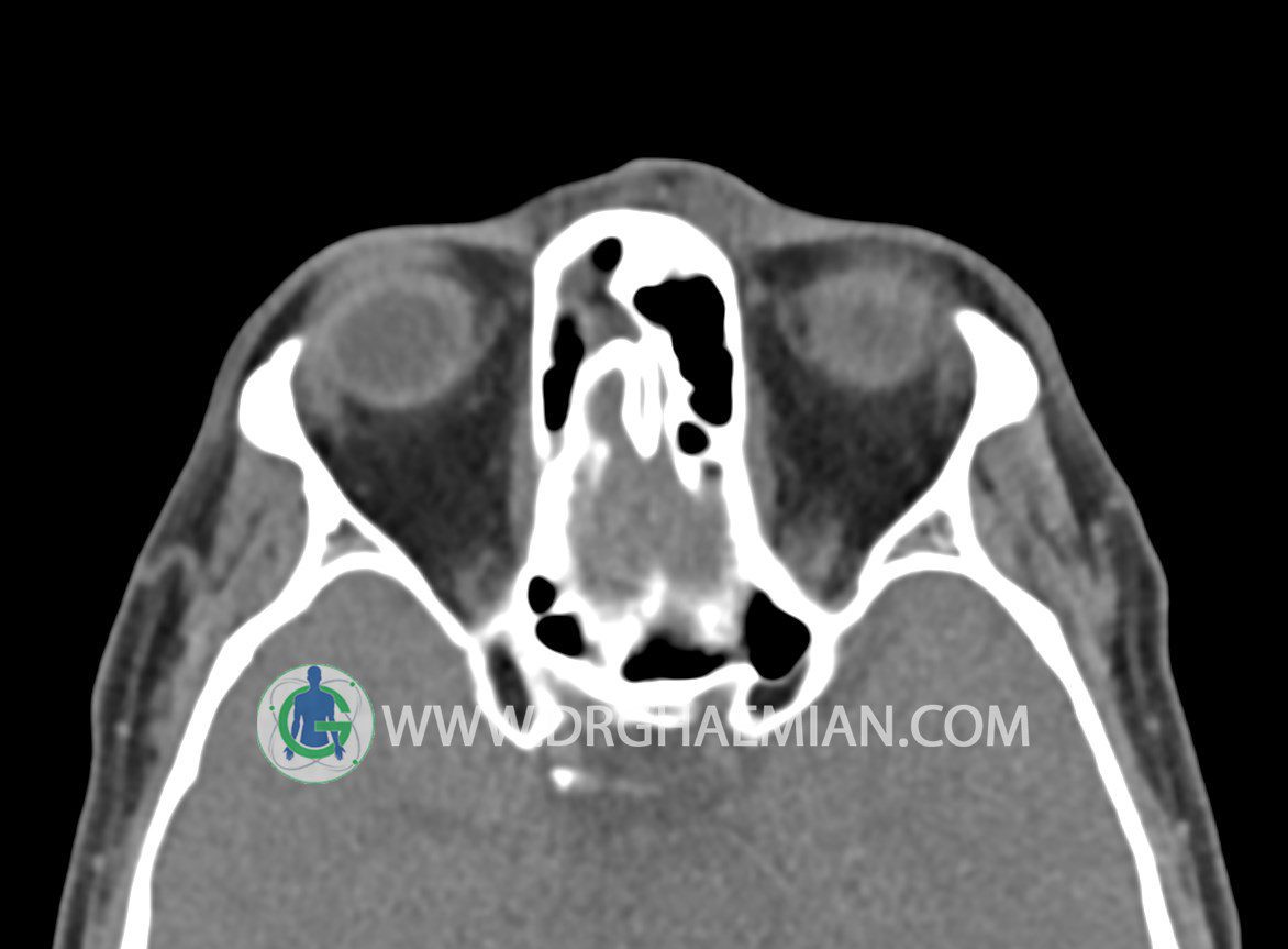 سی تی اسکن اوربیت یک روش تصویربرداری است. این روش از تششعات برای ایجاد تصاویری با جزییات از حفره های چشمی (اوربیت ها)، چشمان و استخوان های پیرامون ایجاد می کند. در این کیس ساختمان سيستيک اوربیت، افزایش ضخامت مخاطی، انحراف سپتوم و کونکا بولوزا دیده می شود.