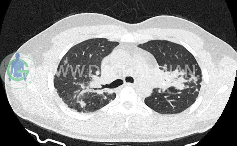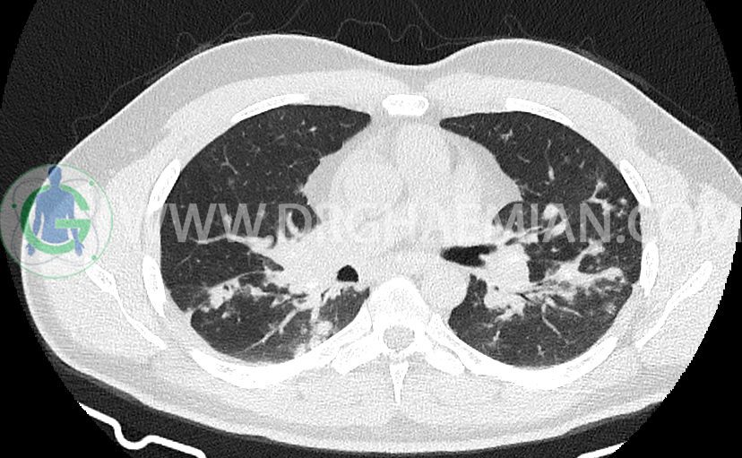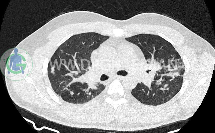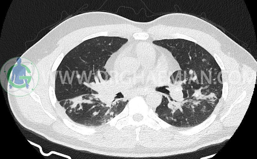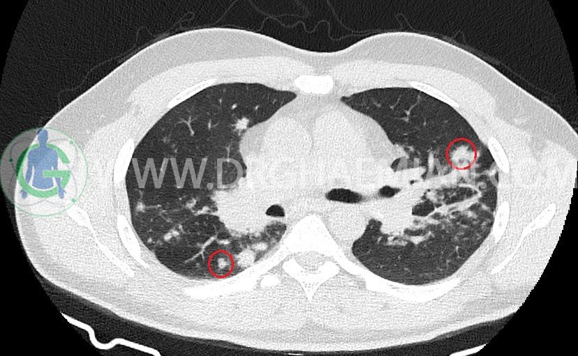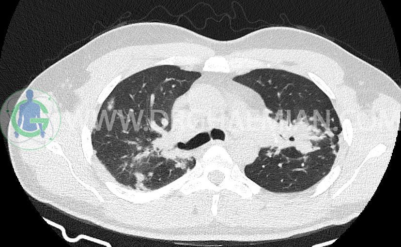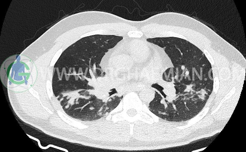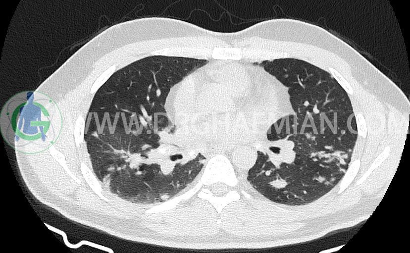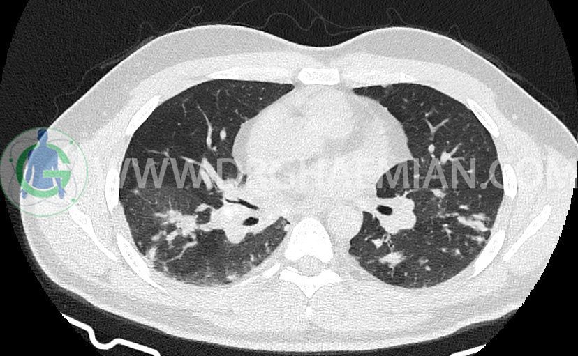 کدورت های ندولار متعدد دو طرفه بعضا اسپیکوله همراه با consolidation های پری برونکووسکولار دو طرف