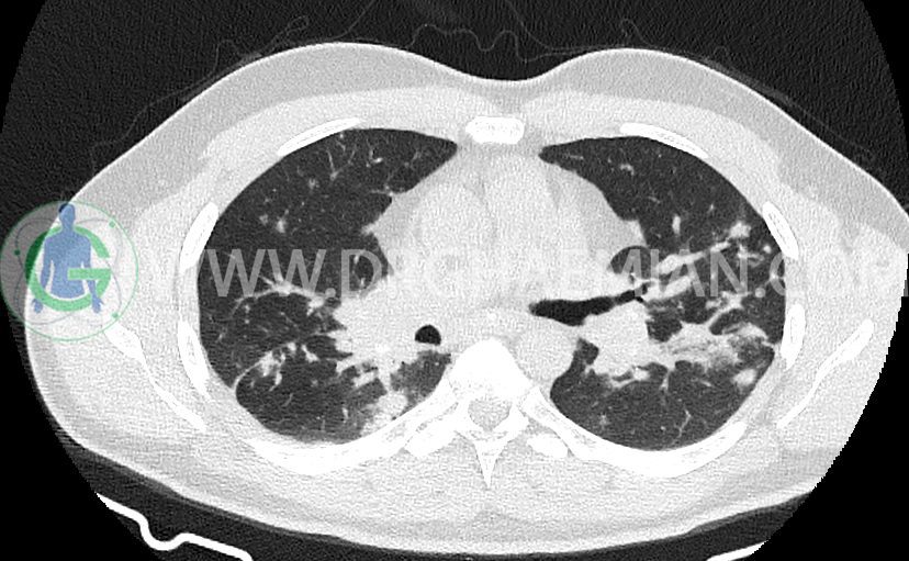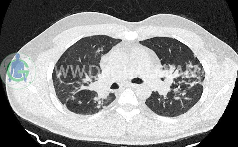 سی تی اسکن ریه با استفاده از اشعه ایکس تصاویر عرضی مقطعی از ریه و بالا تنه ایجاد می کند. در این کیس سارکوئیدوز مرحله دو  به همراه بیماری عفونی در ریه مشاهده می شود.