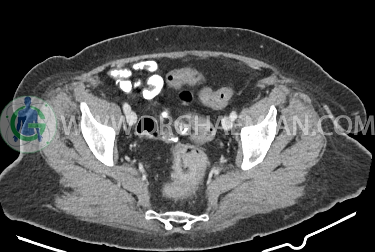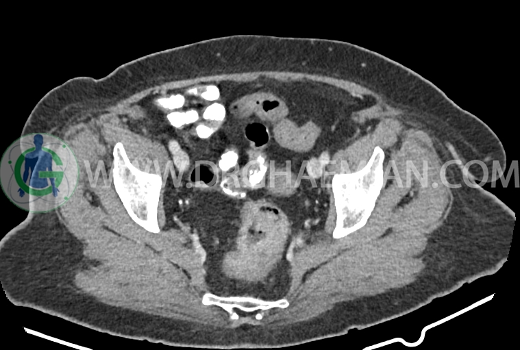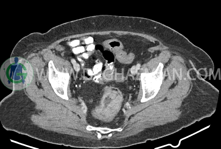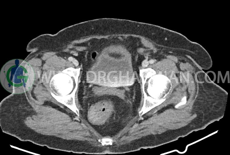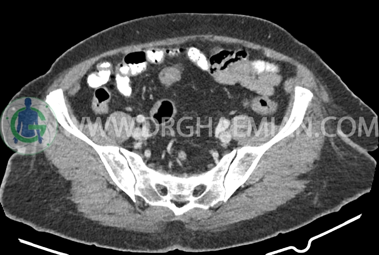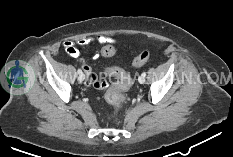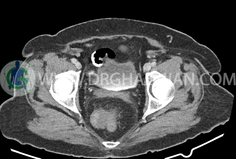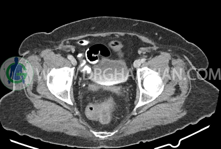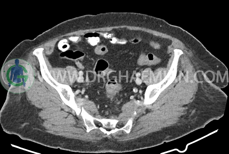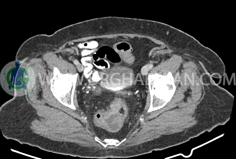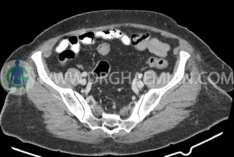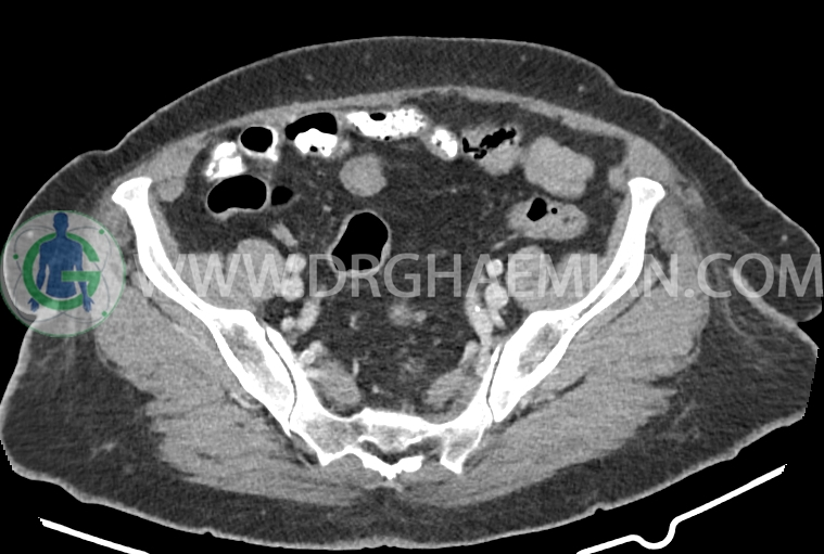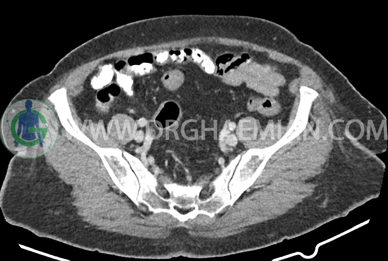 سی تی اسکن شکم و لگن از تششعات برای ایجاد تصاویر عرضی مقطعی از نایحه شکم و لگن استفاده می کند. در این کیس سرطان روده بزرگ، افزایش ضخامت دیواره رکتوم، کلسیفیکاسیون دیواره آئورت و … دیده می شود.
