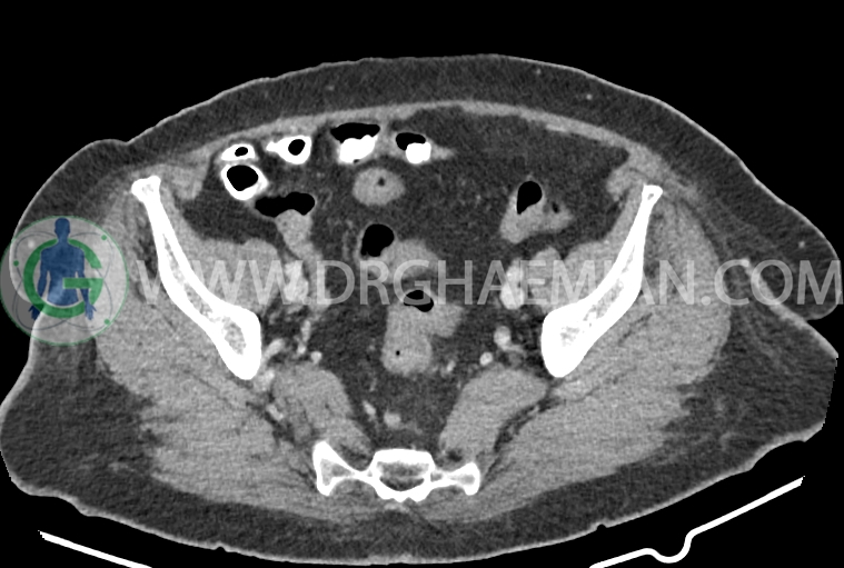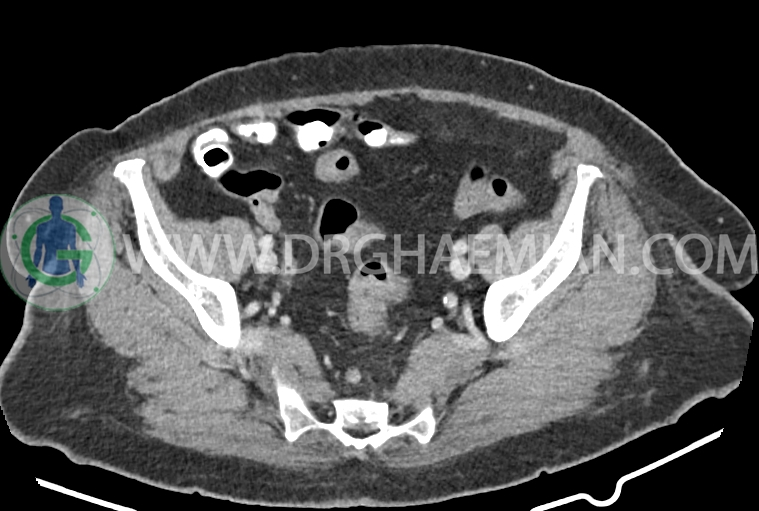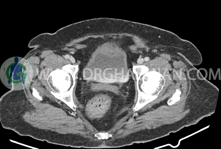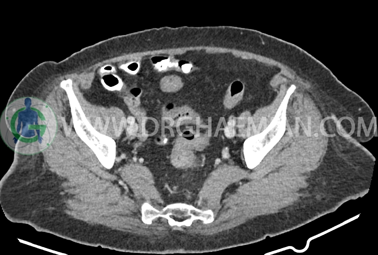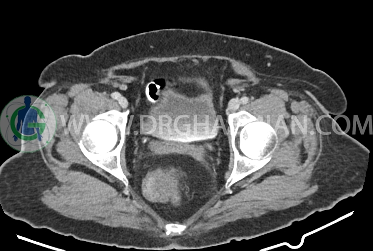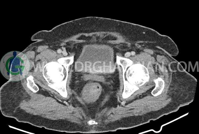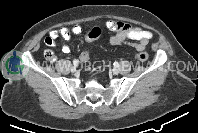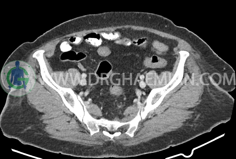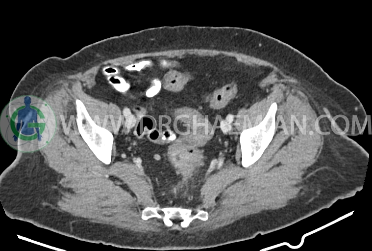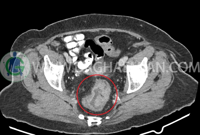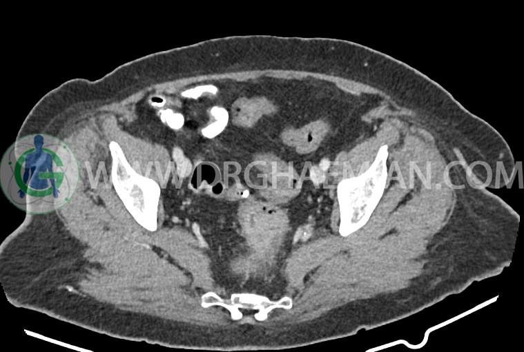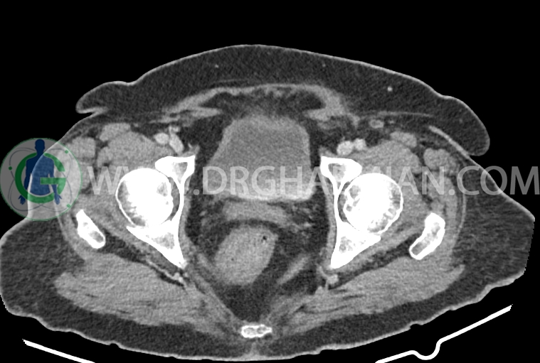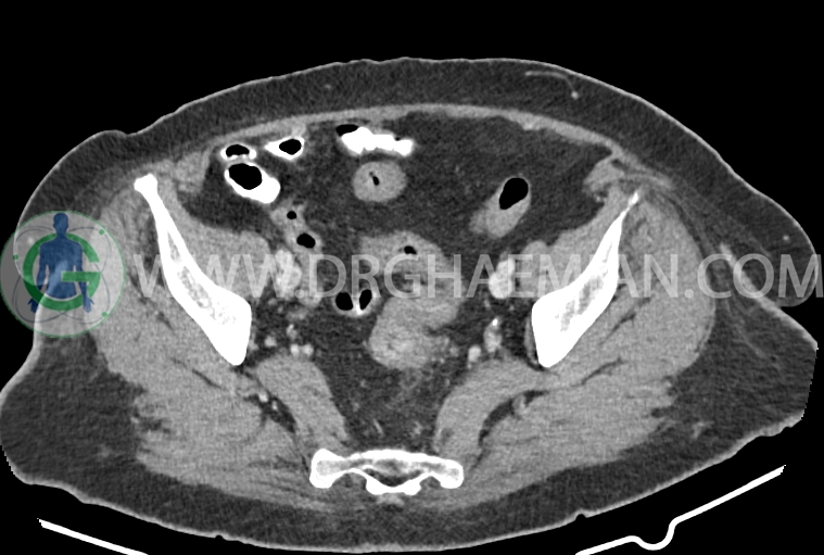سی تی اسکن شکم و لگن از تششعات برای ایجاد تصاویر عرضی مقطعی از نایحه شکم و لگن استفاده می کند. در این کیس سرطان روده بزرگ، افزایش ضخامت دیواره رکتوم، کلسیفیکاسیون دیواره آئورت و … دیده می شود.