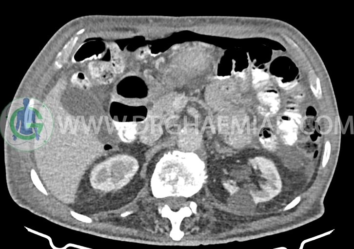 سی تی اسکن شکم و لگن با استفاده از اشعات ایکس تصاویر عرضی از ناحیه شکمی ایجاد میکند. در این کیس سرطان معده، لنفادنوپاتی، آدنوم، دیورتیکول، کیست های کورتیکال و آسیت دیده می شود.