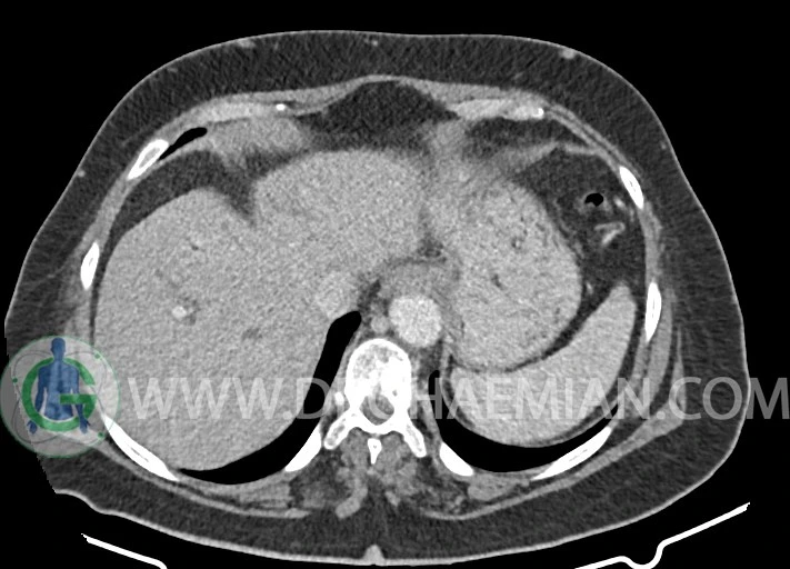 در سی تی اسکن اسپیرال شکم و لگن بدون کنتراست – باکنتراست در فاز ارتریال، پورتال و تاخیری 5 دقیقه و 10 دقیقه (5 فاز) (مولتی دیدکتور 16 با مقاطع ظریف و بازسازی های ساژیتال و کرونال) :
