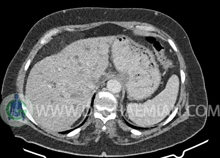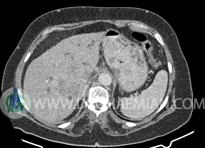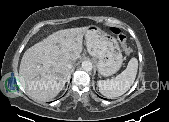 چند لنفادنوپاتی با حداکثر SAD=15mm در اطراف آئورت، IVC، سلیاک، مزانتریک، SMA و پورتاهپاتیس و آئورتوایلیاک راست مشهود است.
