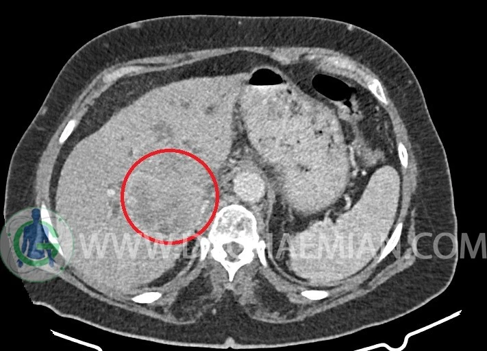 توده مشابه به قطر 25mm در لبه تحتانی سگمان 6 کبد رویت شد .