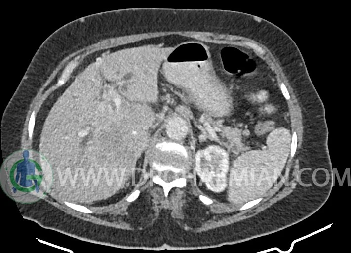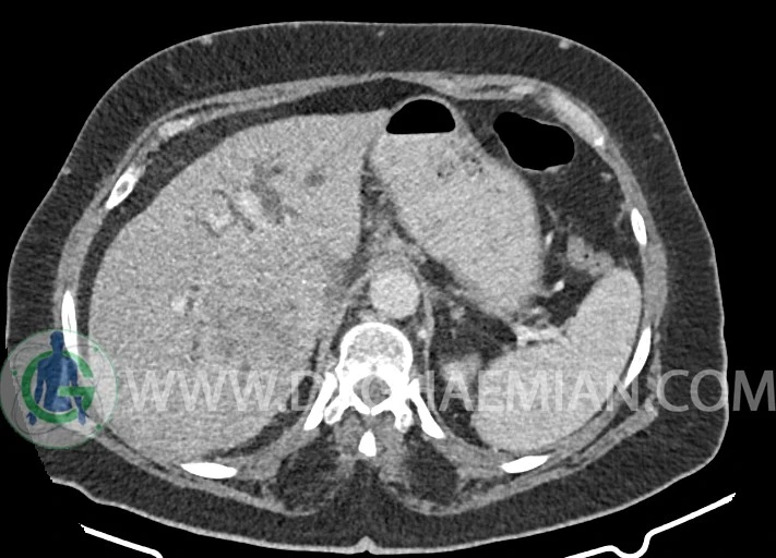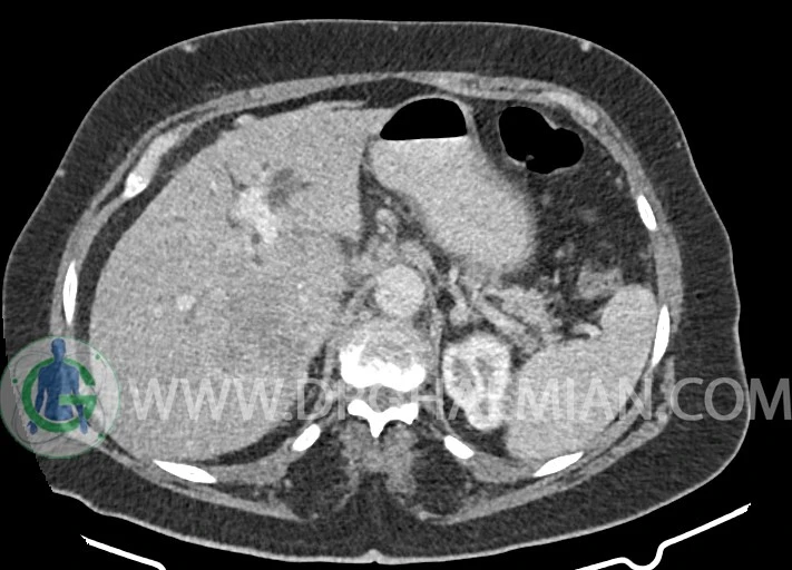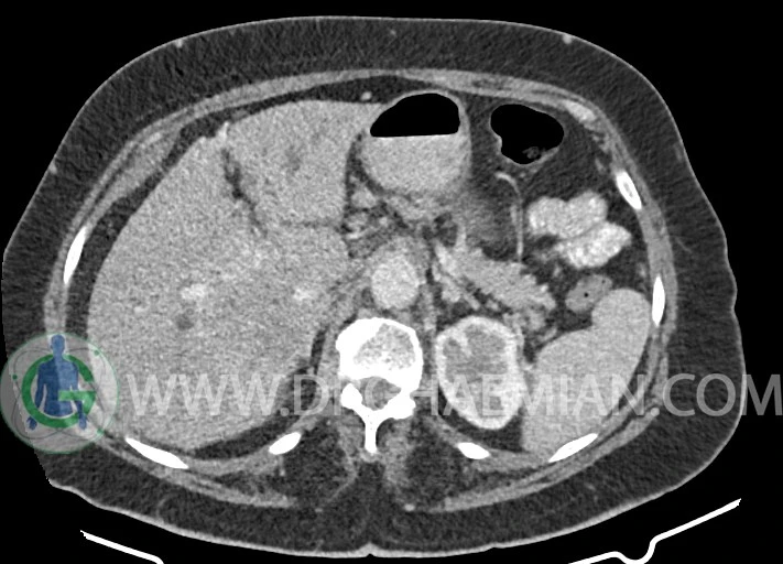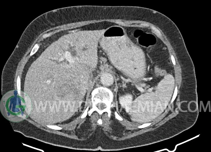 توده ایزودنس اندکی hypoenhancement در فاز ارتریال و پورتال به ابعاد 55x60mm در قسمت سنترال کبد بین سگمان 6 و 7 کبد همراه با دیلاتاسیون مجاری صفراوی داخل کبدی و collapse کیسه صفرا مطرح کننده تومور کبدی مثل کولانژیوکارسینوما با نشانه های تهاجم به پورتاهپاتیس و encasement IVC مشهود است.