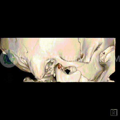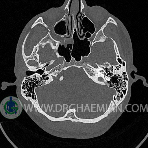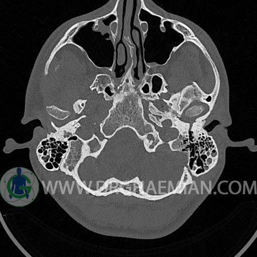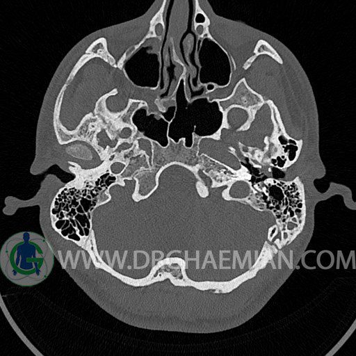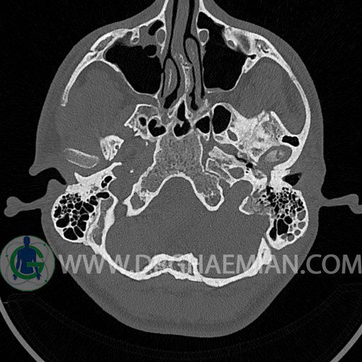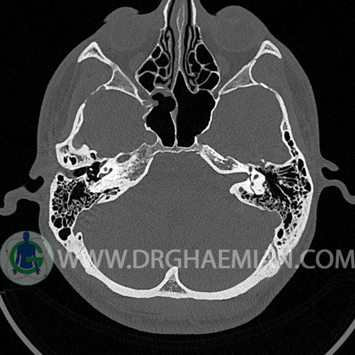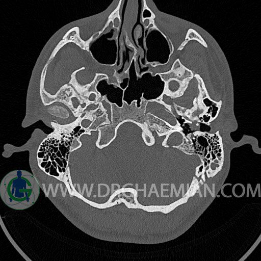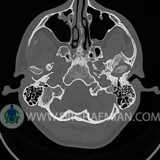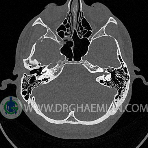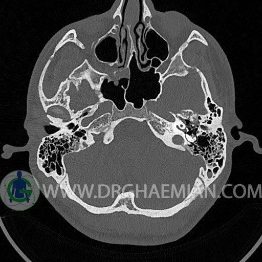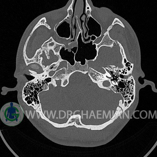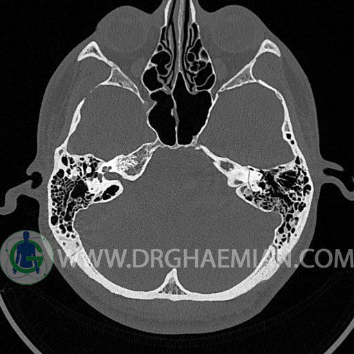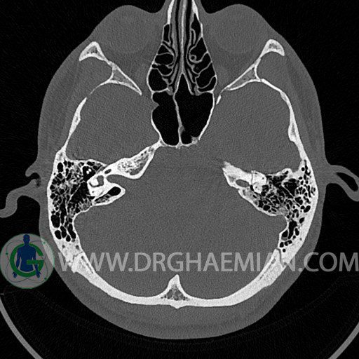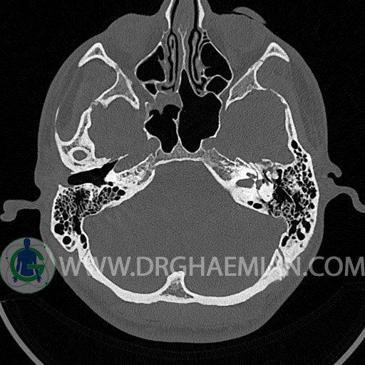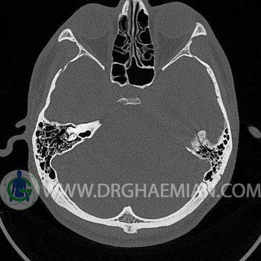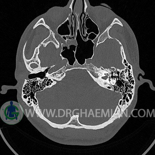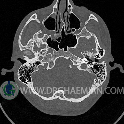 سی تی اسکن گوش داخلی به رادیولوژیست اجازه می دهد تا سطوح مختلف، یا اسلایس هایی از استخوان های که از جمجه به گوش می روند را از طریق اجواج ایکس چرخشی مشاهده کند. با مشاهده این اسلایس ها رادیولوژیست می تواند استخوان های جمجمه را برای صدمه، عفونت، سطوح مایعات و موارد غیرطبیعی ارزیابی کند. در این کیس شکستگی ماستوئيد چپ و تعدادی مورد دیگر مشاهده می شود.