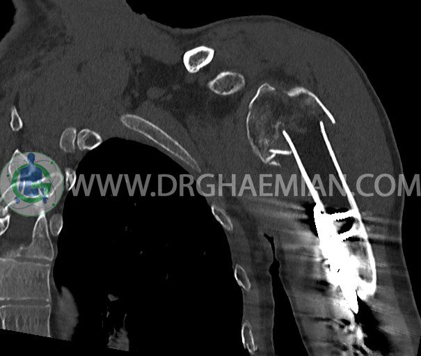 سی تی اسکن کتف یک روش تصویربرداری است که با استفاده از تشعشعات تصاویر عرضی مقطعه ایی از کتف ایجاد می کند. در این کیس شکستگی کتف در متااپيفيز پروگزيمال هومروس چپ و تثبیت داخلی قسمت میانی ديافيز هومروس دیده می شود.
