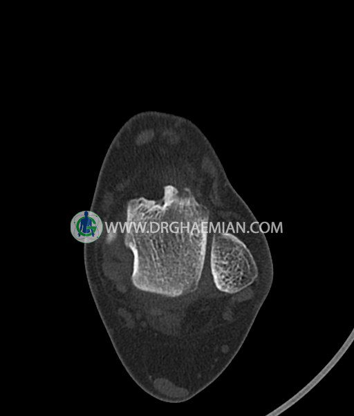سی تی اسکن مفاصل از پرتوی نازک تششعات و حلقه ایی از تششعات که به سرعتی بالا حرکت می کنند برای گرفتن اطلاعات از زوایای مختلف استفاده می کند که خود برای ایجاد تصاویر عرضی مقطعی استفاده می شود. در این کیس ضایعه استئوکندرال مچ پا مشاهده می شود.
