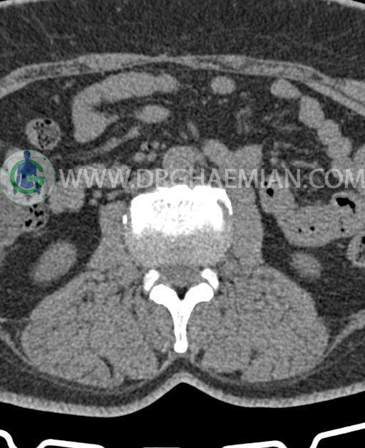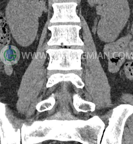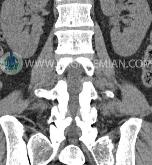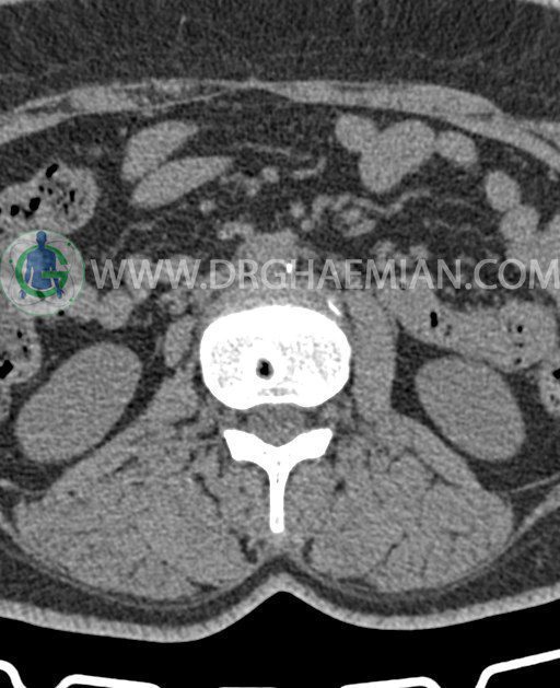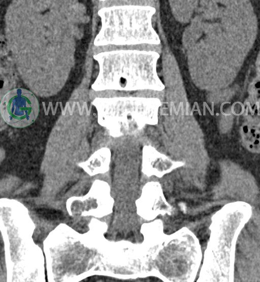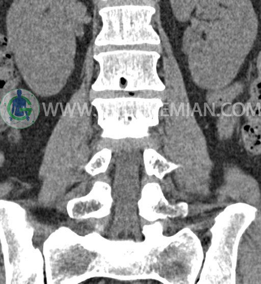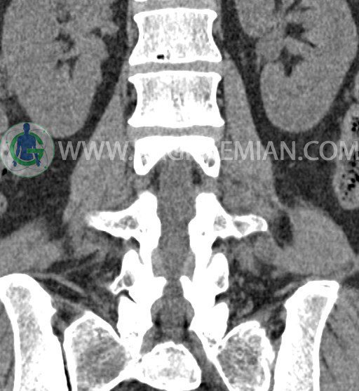 سی تی اسکن ستون فقرات پایینی تصاویری عرضی از ناحیه پایین ستون فقرات ایجاد می کند. این تصویربرداری از تشعشعات برای ایجاد تصاویر استفاده می کند. در این کیس عارضه خلاء در کمر، کاهش فاصله دیسک در دیسک های L2/L3 و L1/L2 و گره اشمورل دیده می شود.