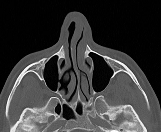 در HRCT اسپيرال از سينوس هاي پارانازال مقاطع کرونال و آگزيال ( 16 اسلايس و مقاطع ظريف 1.5 mm بدون فاصله ، با پنجره استخواني و نسج نرم ) :