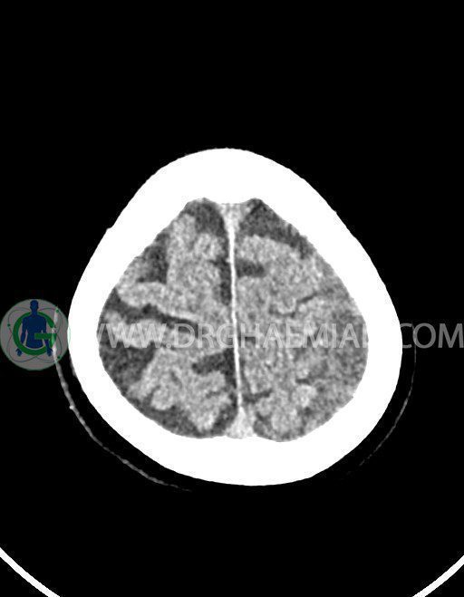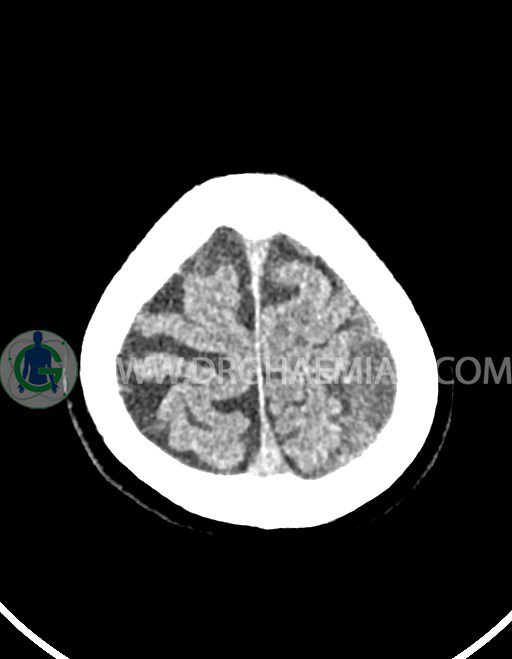هاي پريتال چپ ( gyral effacement )، شيفت خط وسط به راست به ميزان 2 mm و نشانه هاي