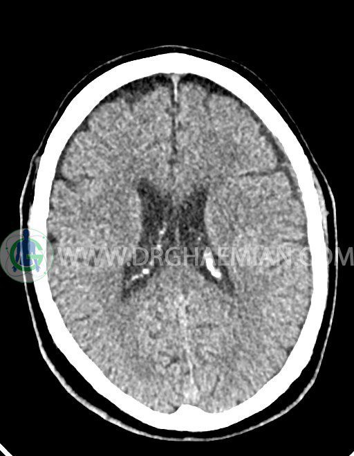 سی تی اسکن مغز با استفاده از اشعه ایکس تصاویری از سر که شامل جمجعه، مغز، حفره های چشمی و سینوس ها است ایجاد می کند. در این کیس فتق پایین رونده مغز و اتروفی فوکال دیده می شود.