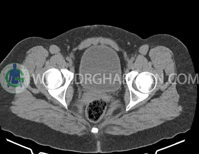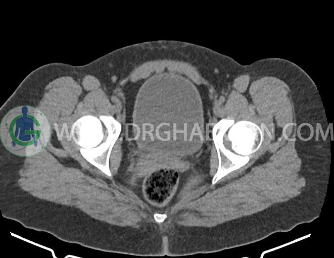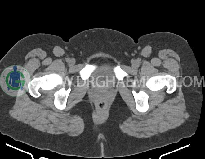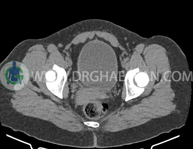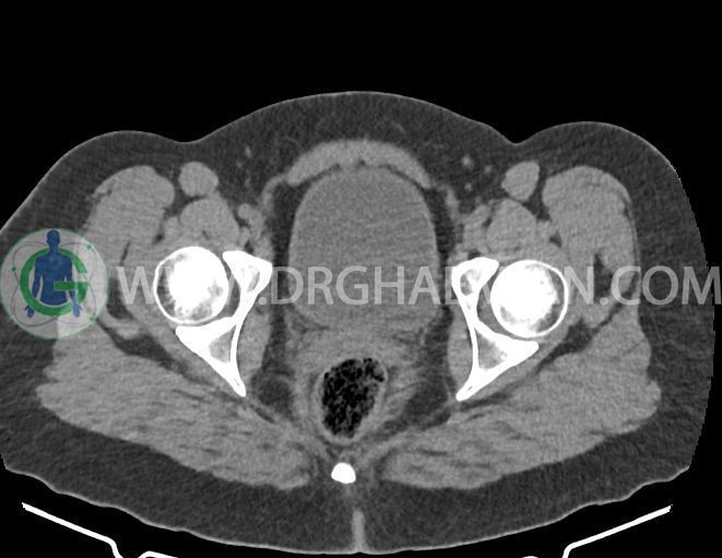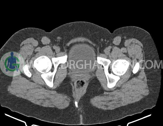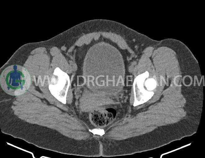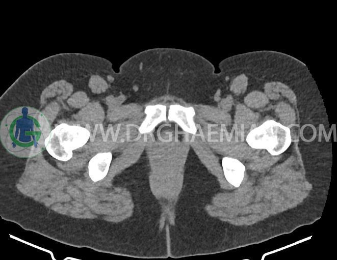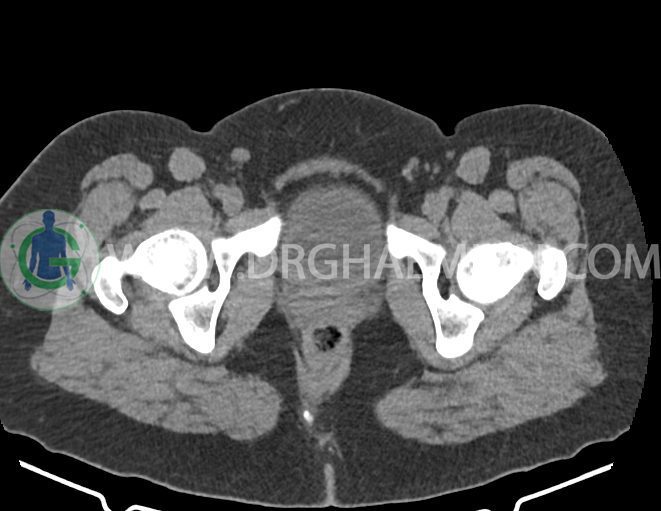 سی تی اسکن شکم و لگن با استفاده از تشعشعات تصاویر عرضی از ناحیه شکم و لگن ایجاد میکند. در این کیس دو فلبولیت کوچک در لگن، چند گره اشمورل در مهره های کمری دیده می شود.