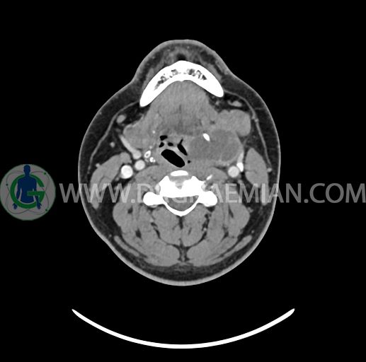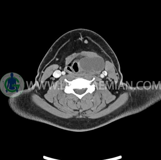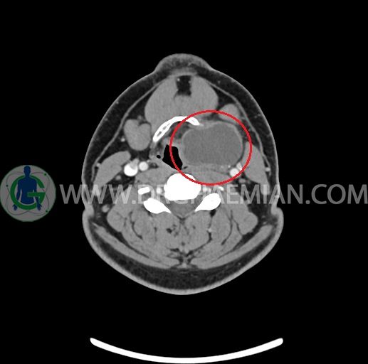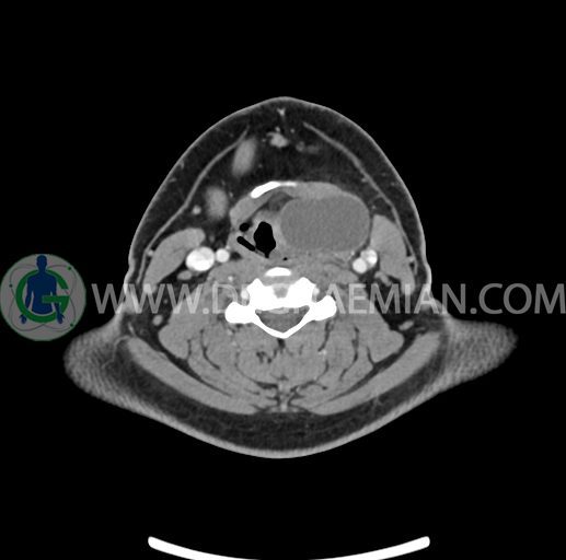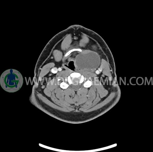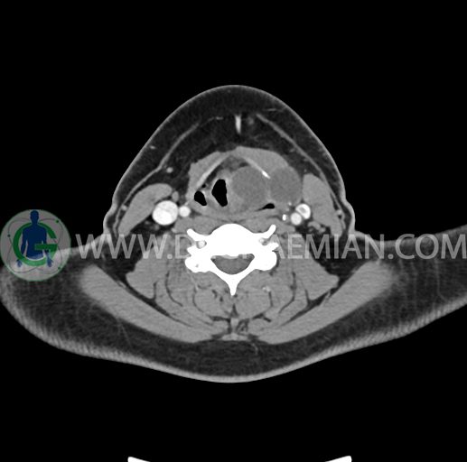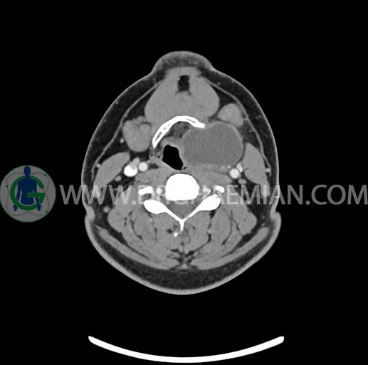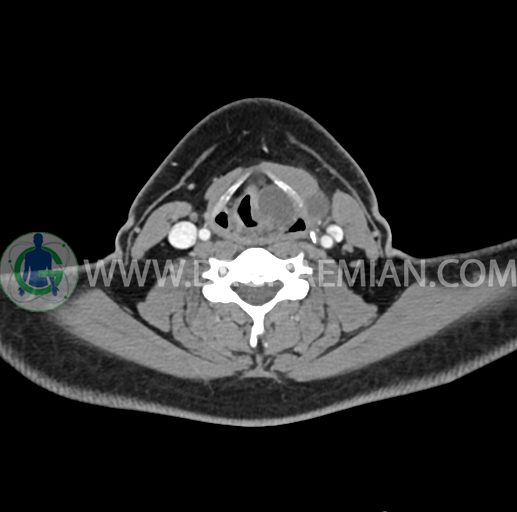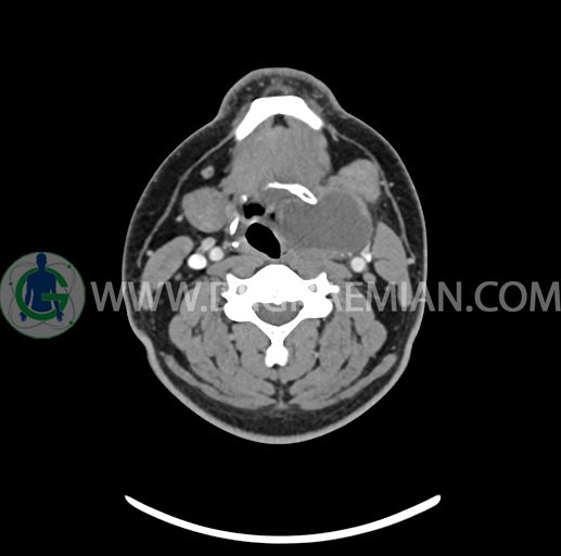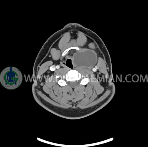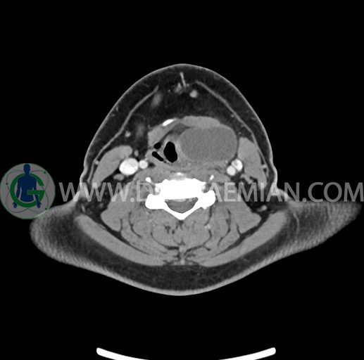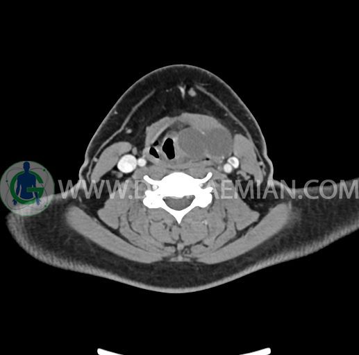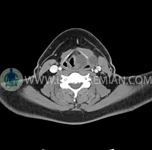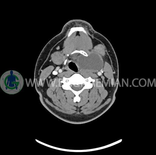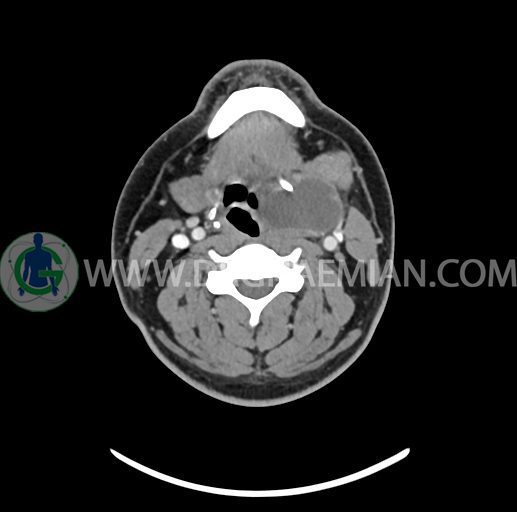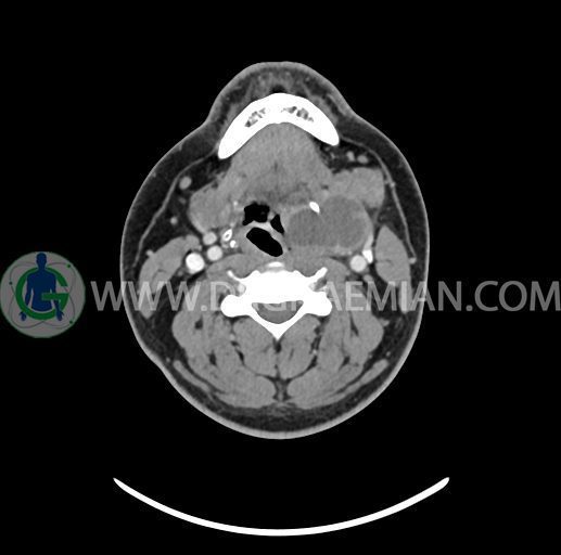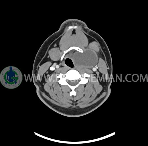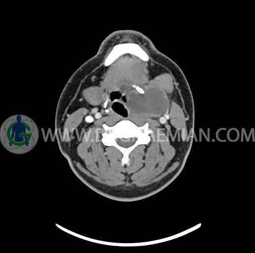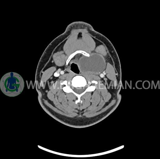 – تصویر ساختار cystic و Well-defined به ابعاد 43x30x33mm در سمت چپ لارنکس با قرارگیری suprahyoid و inferahyoid دیده می شود که گسترش تحتانی آن تا ناحیه ونتریکل است.